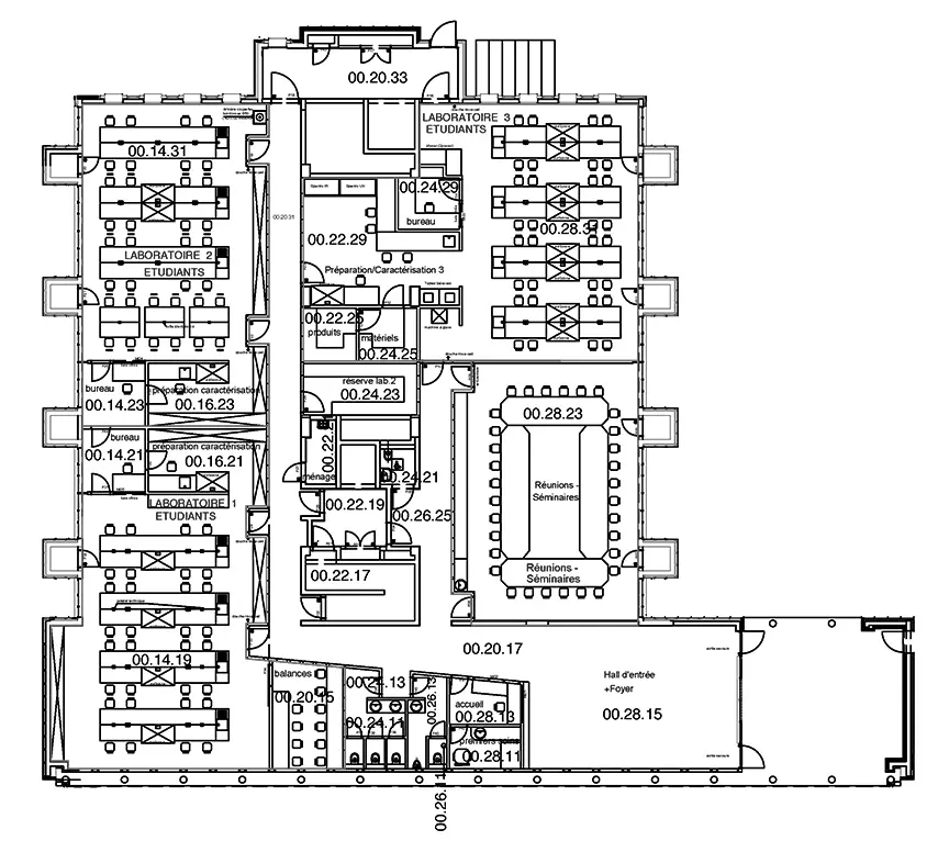 Le projet libère les surfaces de travail en leur conférant une certaine flexibilité, exposant, tant pour les usagers que pour les techniques spéciales, le débat kahnien des espaces servants et des espaces servis. Les éléments qui y concourent se manifestent, côté avenue, par les façades de quatre niveaux du bâtiment d'accueil ou de travail.