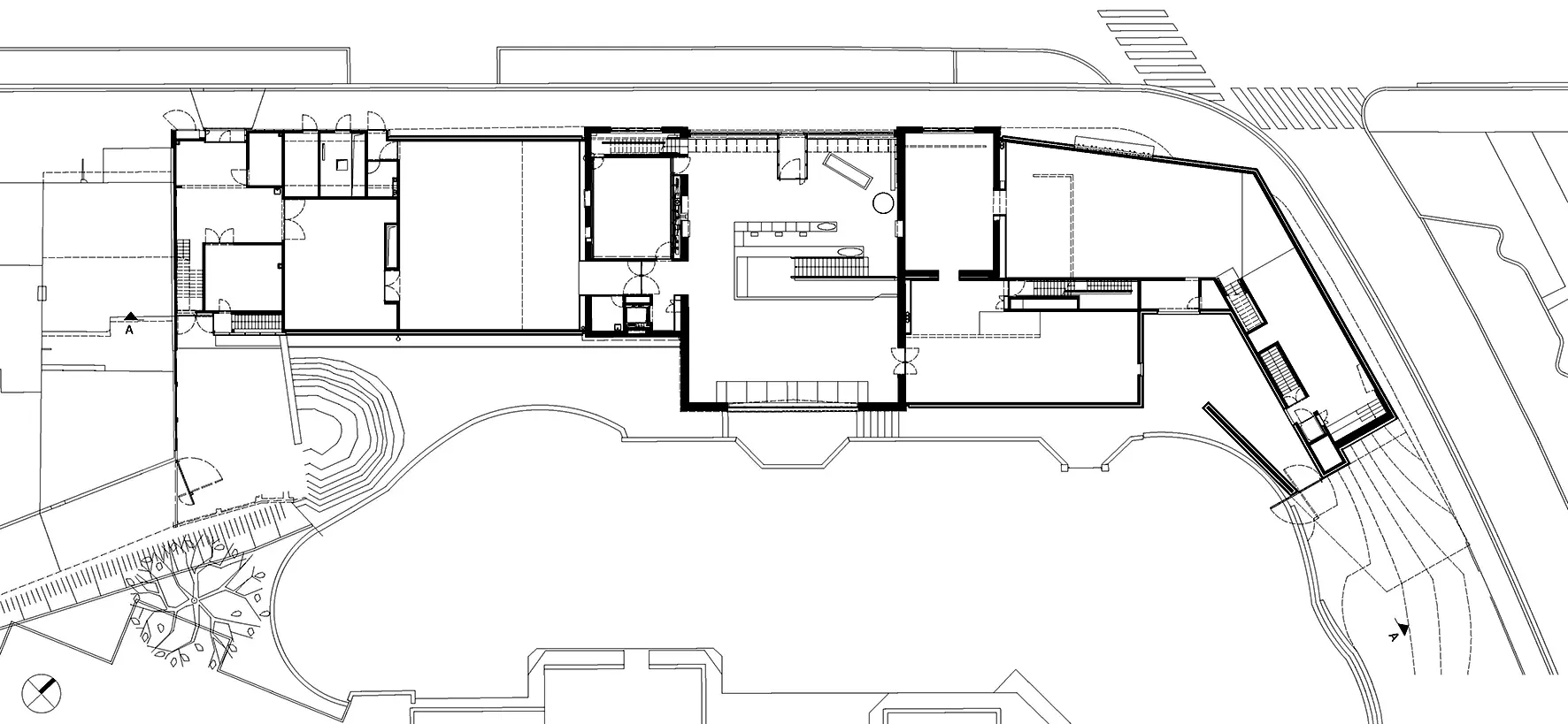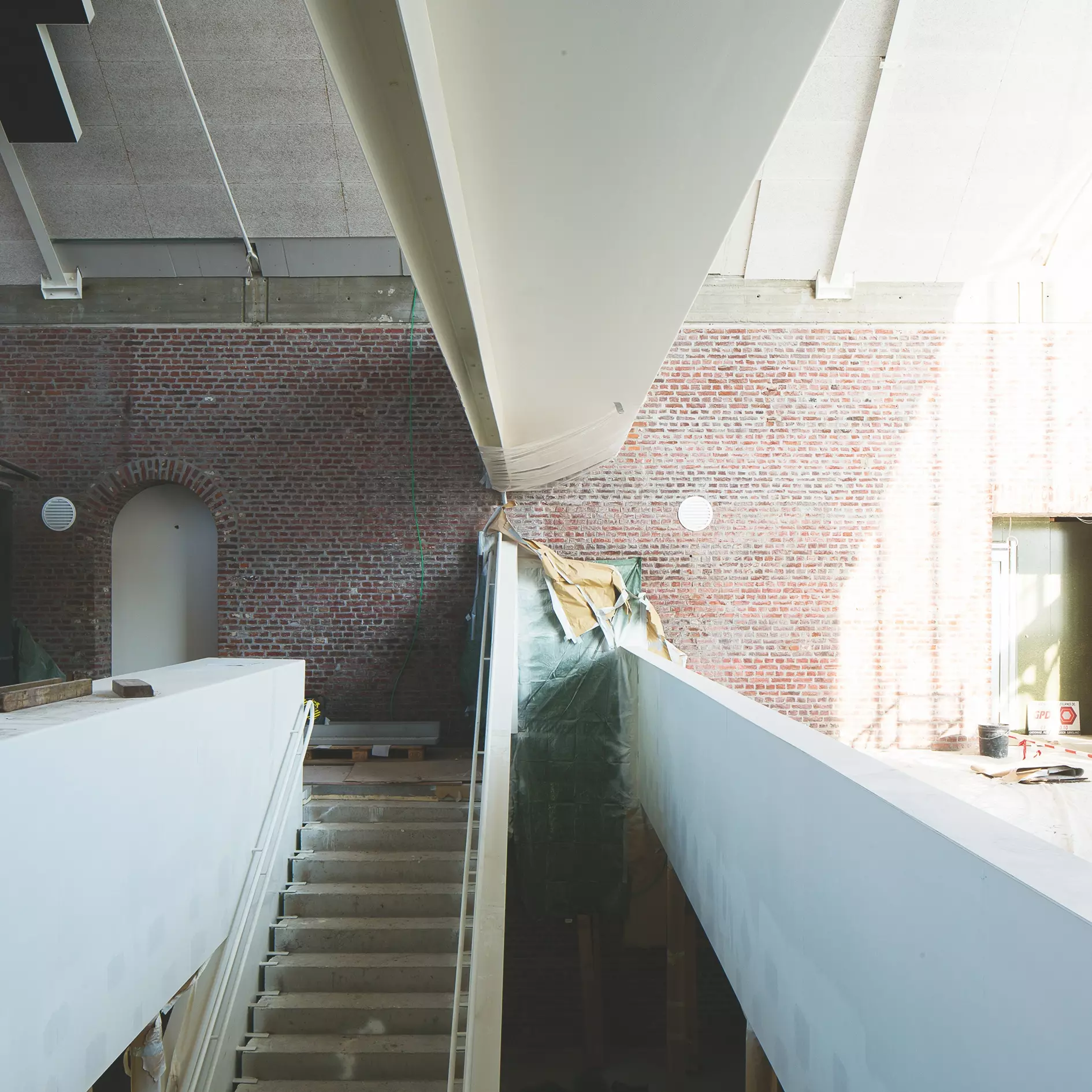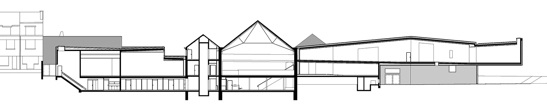 L'ancien édifice devient le point d'accueil et de départ des visites. Les espaces indéfinis qui l'entourent sont requalifiés par un nouveau front bâti contigu formé de deux ailes, à l'angle du boulevard, dont les gabarits s'inscrivent dans la continuité typologique du quartier sans singer son identité propre. La lumière abondante de la Machine à eau est exploitée pour exposer les périodes de liberté. Ailleurs, dosée, colorée, elle accompagne le parcours sensoriel en pente douce des visiteurs au travers des périodes de conflit. Les ouvertures, placées en des points stratégiques, cadrent le regard vers l'extérieur.