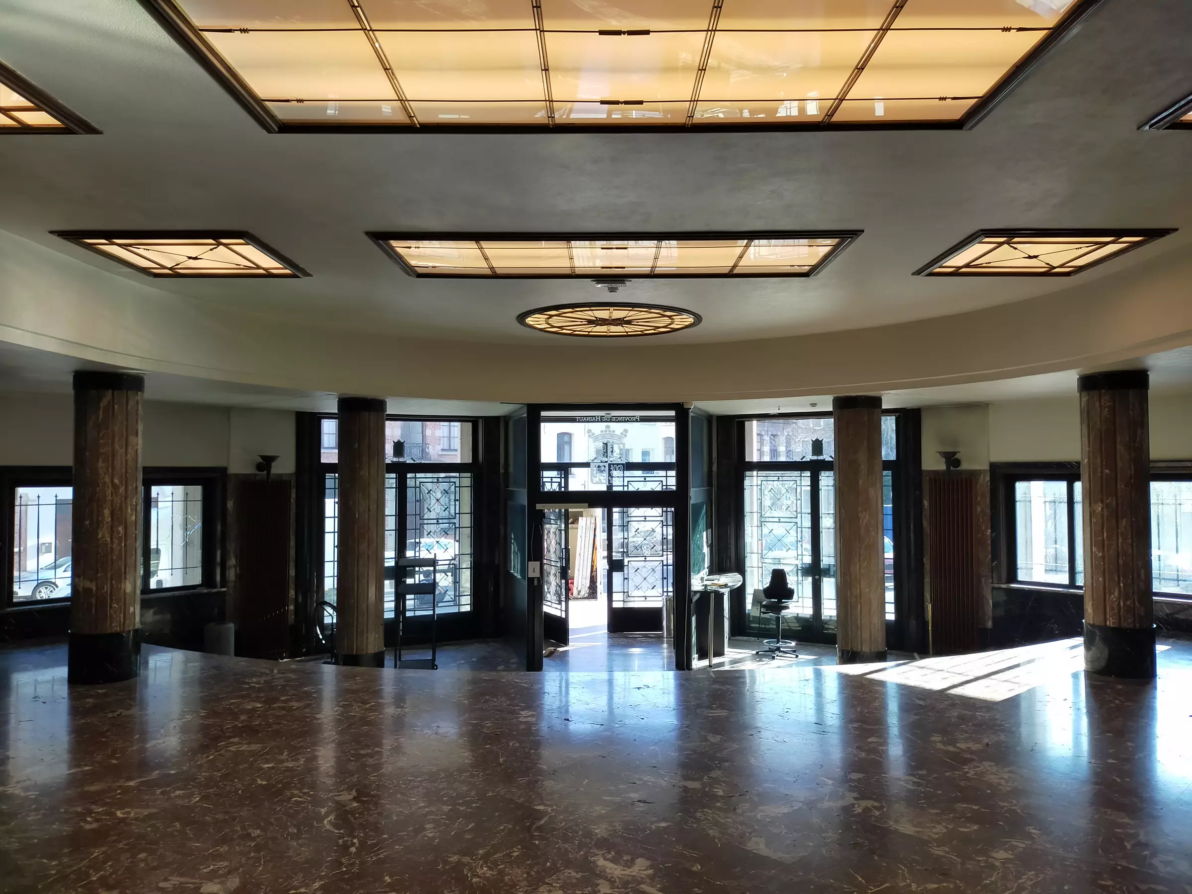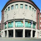 Les architectes soignent la qualité d'exécution (pierre bleue, menuiseries métalliques et portails décoratifs). Plusieurs artistes interviennent dans la conception. En façade, Robert Delnest sculpte des personnages évoquant les métiers emblématiques de l'industrie en Hainaut – mineur de fond, tailleur de pierre, puddleur, souffleur de verre, brasseur et potier – avec, au rez-de-chaussée, des scènes collectives sur le thème du travail agricole et sidérurgique.