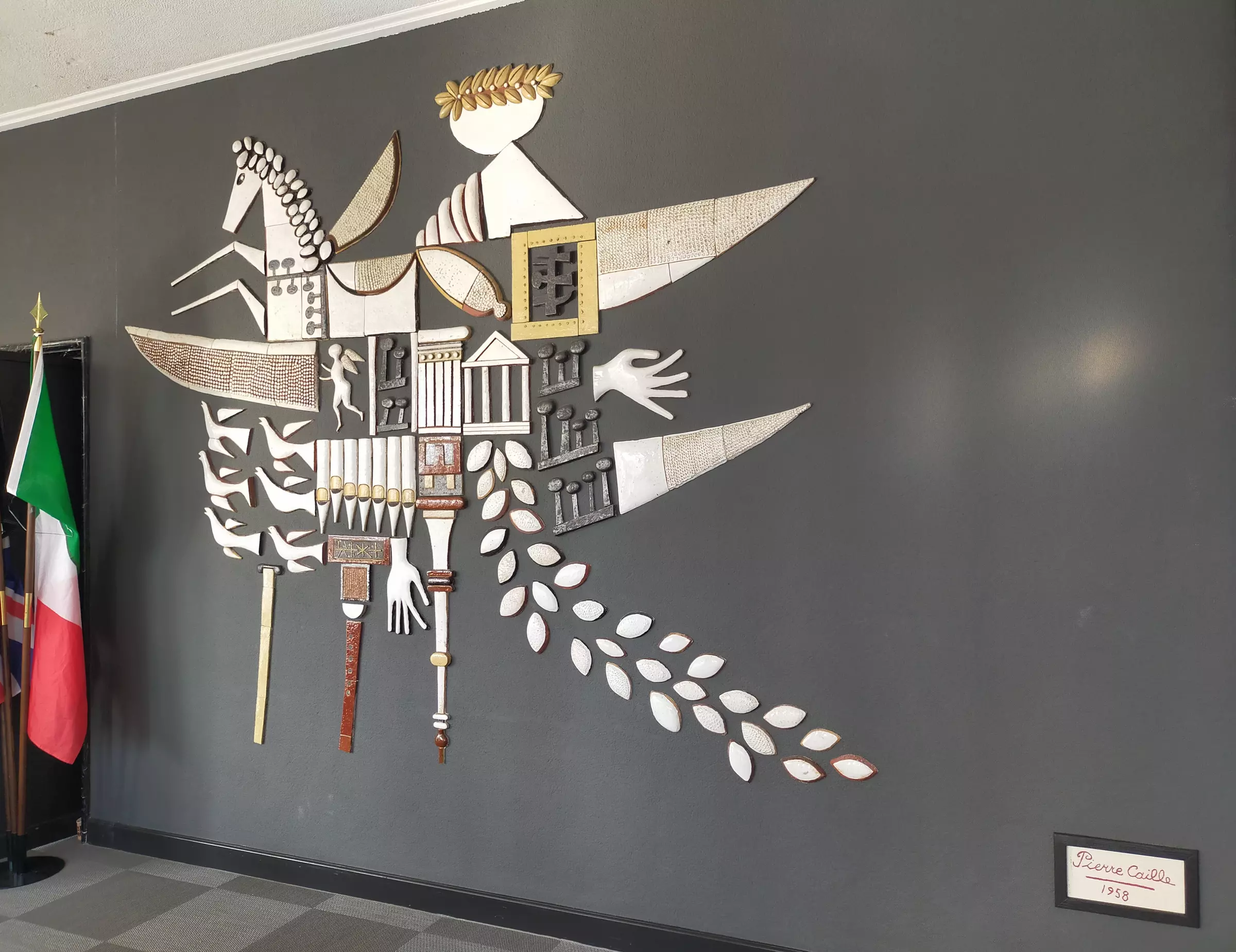 Dans le hall d'honneur où domine le marbre noir, la cage d'escalier monumentale est éclairée par un vitrail de Zéphir Busine et Georges Boulmant, largement illustré de scènes alliant les traditions populaires, le folklore et les métiers industriels. Agnès Leplae et Pierre Caille réalisent deux œuvres murales en céramique émaillée : la première, la Ducasse de Mons, est figurative et la seconde, onirique et plus tardive (1958), destinée à la salle du collège provincial.