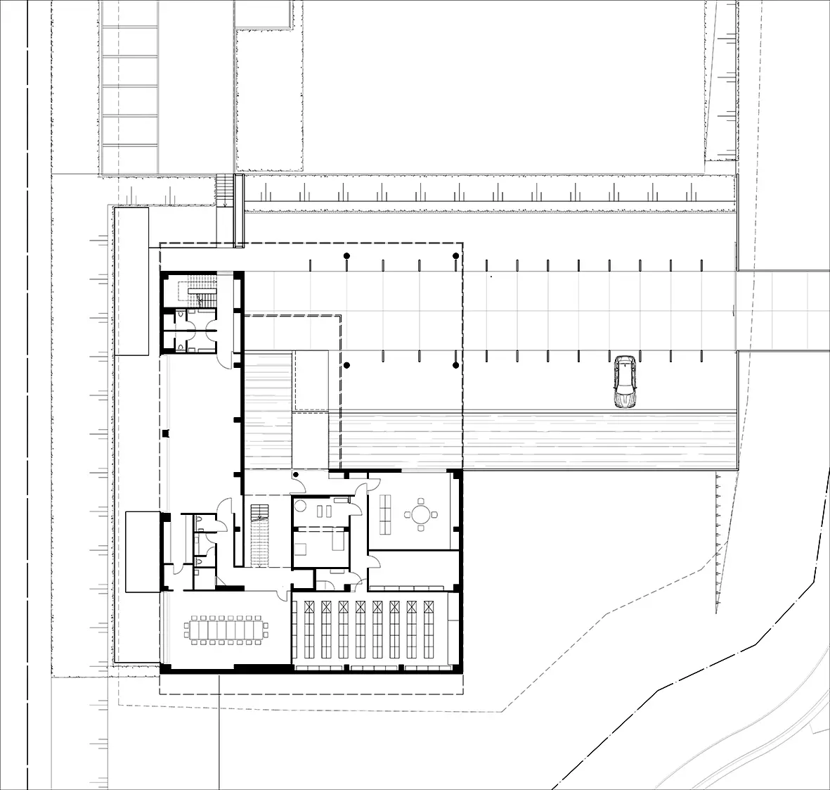 Le terrain étant en déclivité, le bâtiment est semi-enterré en partie haute, tandis qu'en partie basse, il flotte sur un pilotis. L'accès se fait par une allée qui suit un long mur de soutènement bordé d'une pièce d'eau et pénétrant sous le pilotis jusqu'à l'entrée, dans le patio. Celui-ci, au cœur du bâtiment, est protégé par une toile tendue dont la courbure conduit l'eau de pluie dans le bassin que l'on franchit pour entrer. Au niveau bas, il est encadré d'un côté par les locaux techniques, les archives et les salles de réunion ; de l'autre, par les vestiaires, la salle du personnel et l'entrée. Sur les deux autres côtés, l'espace sous pilotis offre des vues dégagées sur les environs. À l'étage, le patio apporte lumière et transparence, côté nord, à l'espace de travail largement vitré, et, côté sud, aux bureaux des gérants et à l'accueil. Un bloc central regroupe l'escalier, l'ascenseur et les sanitaires.