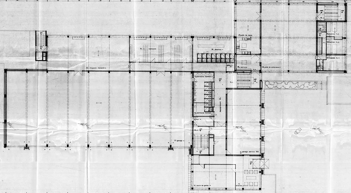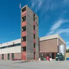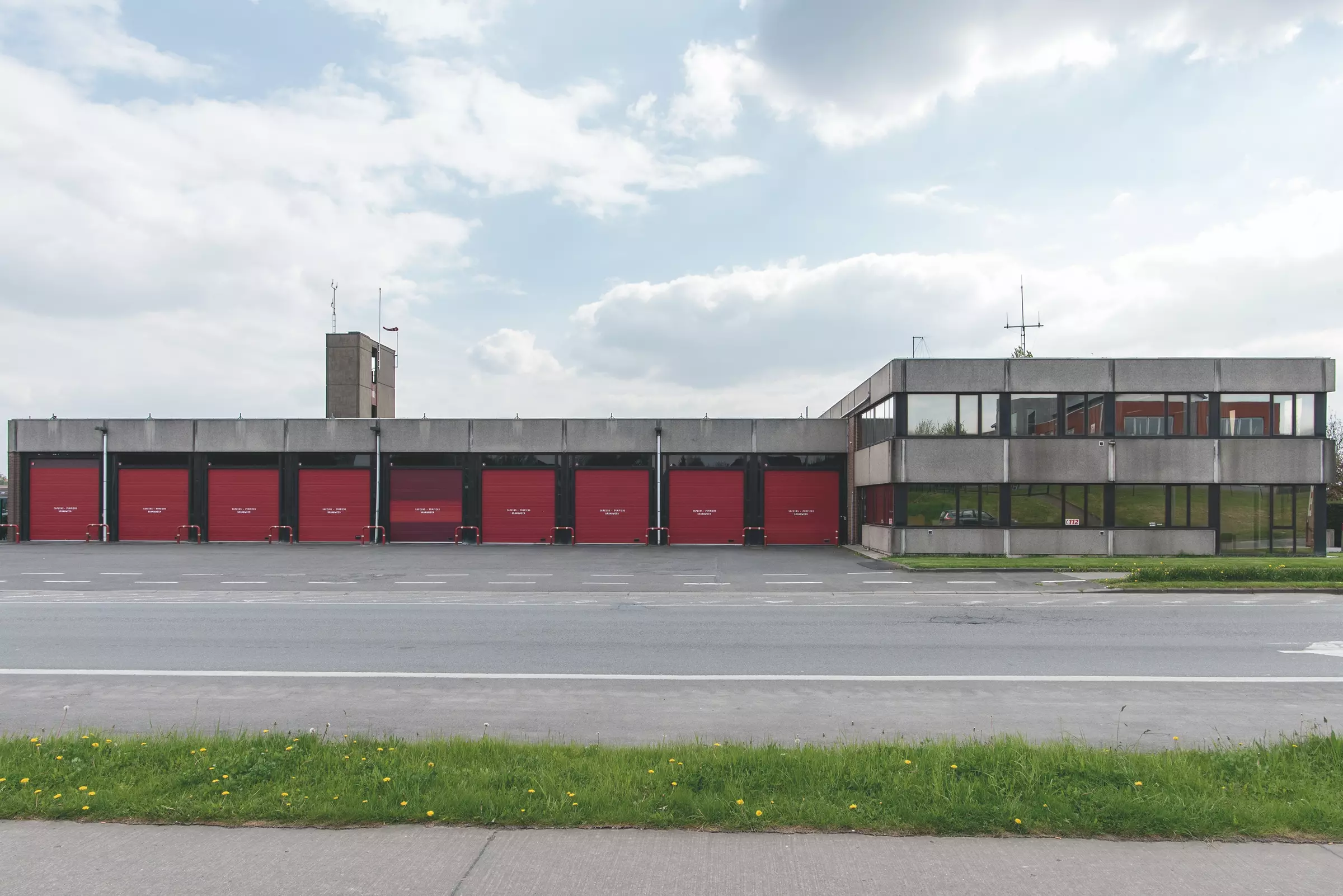 En décidant d'abandonner la caserne existant dans le centre-ville, l'administration entend construire un nouvel équipement plus adapté aux besoins et dans une position plus stratégique pour la gestion des interventions. Le site choisi longe un axe important de circulation, sur d'anciens terrains du chemin de fer. L'équipement, installé parallèlement à la rue, se compose de trois ailes distinctes qui répondent aux exigences de fonctionnement. Grâce à la pente du terrain, une cour a pu être installée à l'arrière, en contrebas. L'équipement est conçu avec des éléments préfabriqués, permettant une économie de moyens et de temps ; son expression architecturale est le reflet d'une démarche pragmatique qui privilégie l'équilibre des masses et la rationalisation des parcours, évitant tout élément superflu et anecdotique.