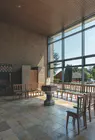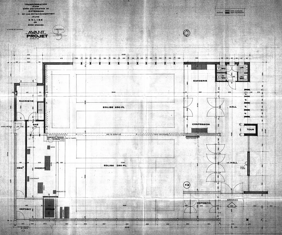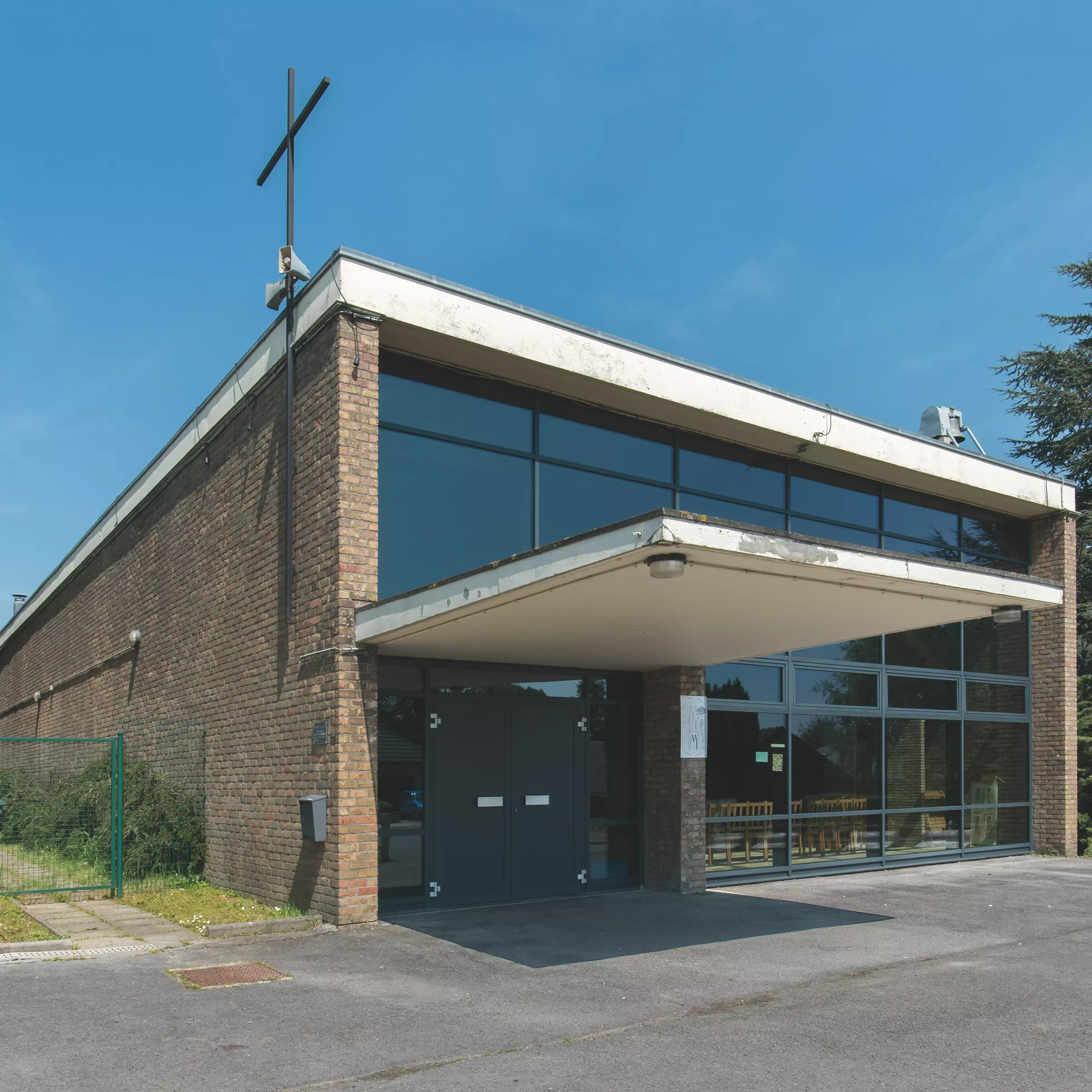 Entre 1962 et 1964, Christian Vastesaeger construit quatre églises du même type en Flandre occidentale. Le volume parallélipédique 12 x 30 x 6 m de brique et de béton, construit dans le nouveau quartier à la Coquinie, n'est, au départ, qu'une salle paroissiale qui sert de chapelle provisoire. C'est un complexe paroissial complet qui est prévu, comprenant, autour de l'école existante, la construction d'un cercle avec conciergerie, d'un presbytère et d'une église aux formes organiques avec tour et chapelle d'hiver. Pour des raisons budgétaires, un nouveau projet prévoyant la transformation de la chapelle par le doublement de la nef est proposé par l'architecte Gilbert Devolder, en 1969. Celui-ci remanie la façade, ajoute une tour et une sacristie. Après le dépôt d'un permis de bâtir pour la modification de la façade en 1971, l'ajout d'une sacristie, en 1979, transforme la chapelle provisoire en église. Cette boucle explique sans doute le rapport visuel intérieur-extérieur par le vitrage intégral du côté latéral du chœur et de la façade avant : inhabituel et peu sacralisant pour un lieu de culte.