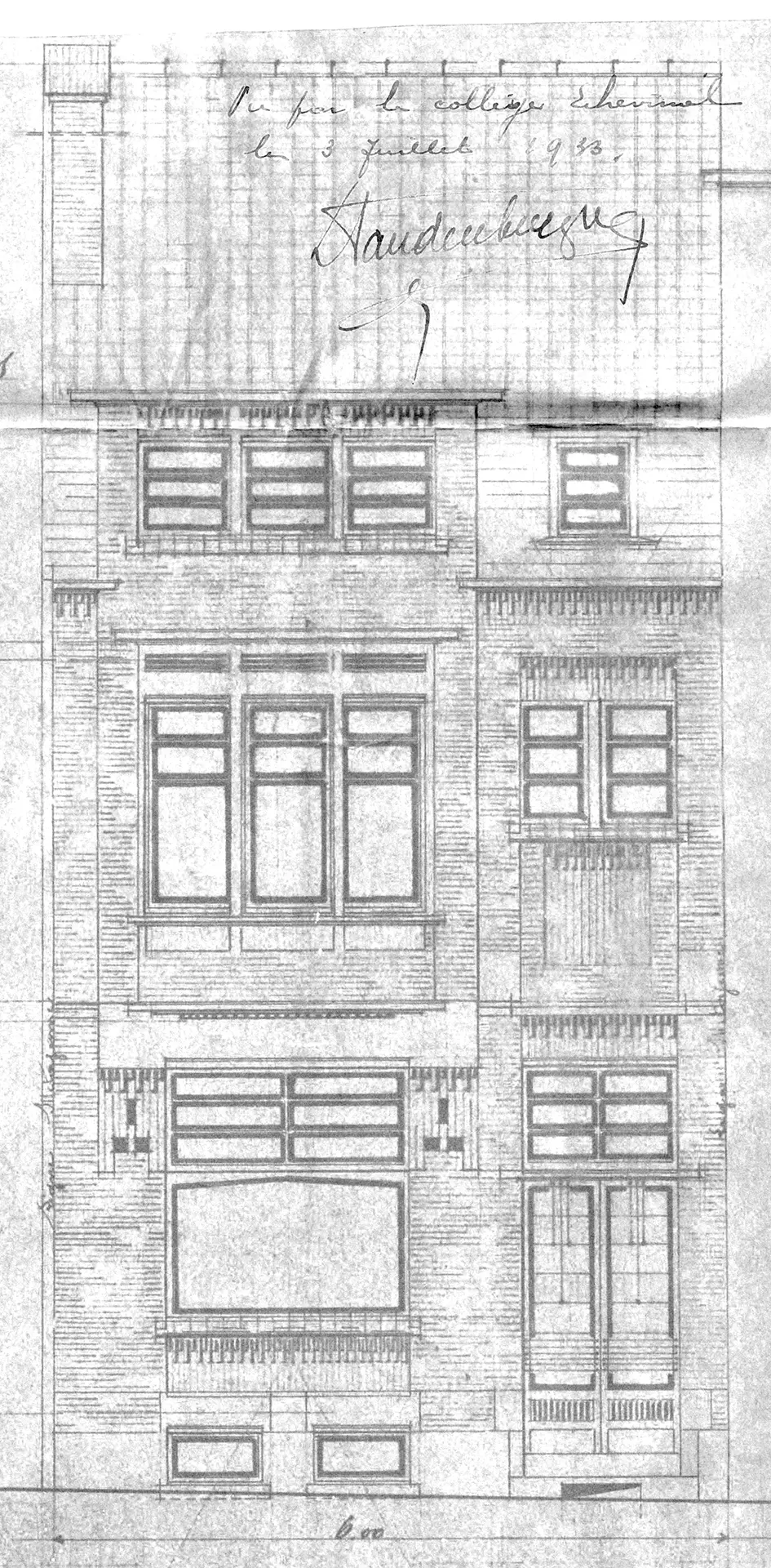Cette façade, assez différente de celle proposée dans l'avant-projet, est caractérisée par un travail des briques d'influence Art déco chatoyant dans les allèges et les linteaux. La polychromie de la maçonnerie et le traitement en creux des allèges et de l'encadrement de fenêtre au-dessus de l'entrée créent un ensemble d'une grande subtilité. Toutes les menuiseries sont d'origine et parfaitement entretenues. À remarquer : les seuils des fenêtres en terre cuite vernissées en noir ainsi que le remarquable travail de ferronnerie de la porte d'entrée. Le plan est dans la tradition des maisons bourgeoises mitoyennes. Au sous-sol : caves, buanderie et chaufferie. Au rez-de-chaussée : bureau, salon, salle à manger et cuisine. Au premier étage : trois chambres et une salle de bains. Au deuxième étage : une chambre et un grenier.