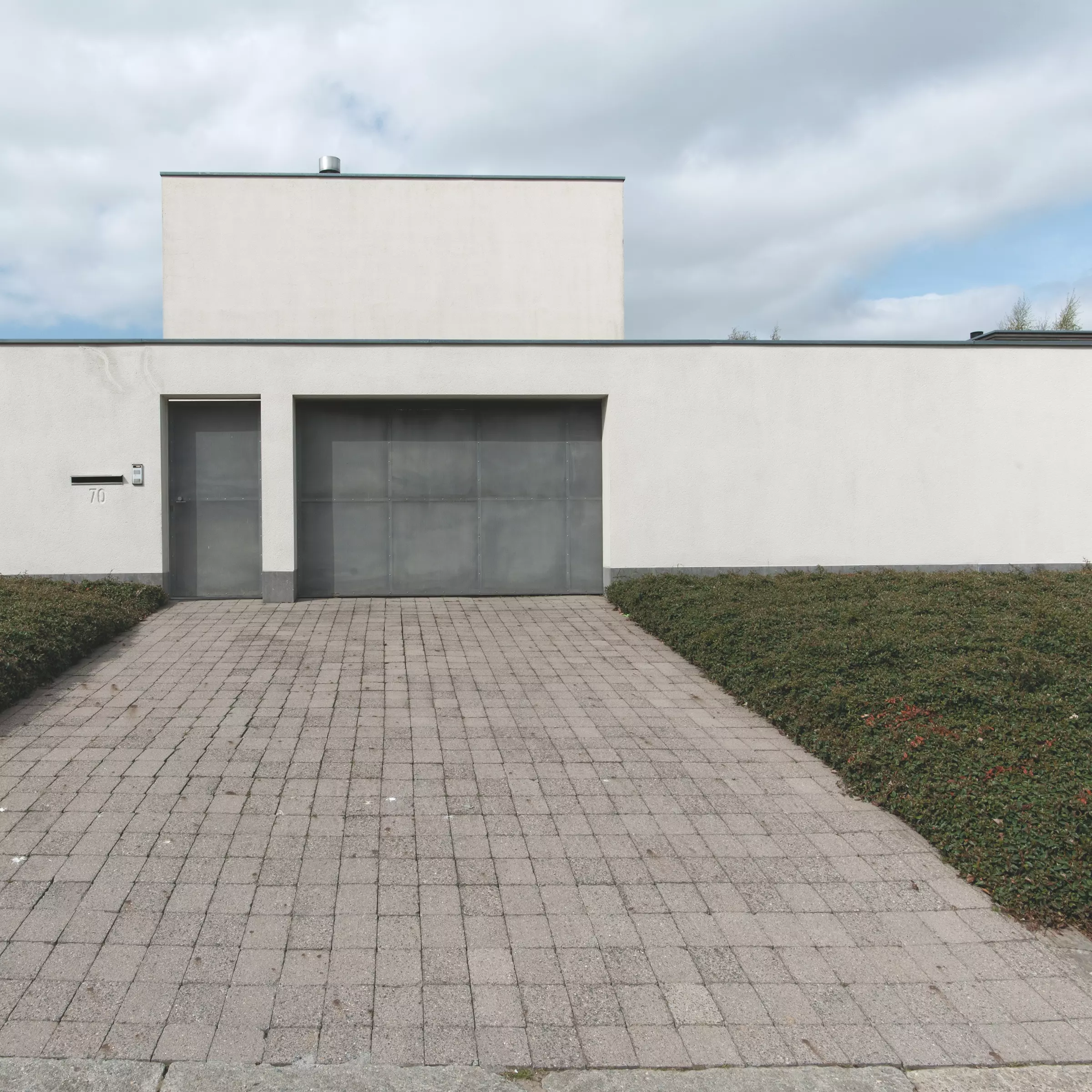 Cachée derrière un long mur blanc, la maison, telle qu'elle se présente aujourd'hui, résulte de plusieurs adaptations. Elle ne comporte à l'origine qu'un seul volume à deux niveaux, perpendiculaire à la rue, dont une partie, sur pilotis, abrite le carport. Au fond de celui-ci, passé le hall d'entrée, on pénètre dans un séjour à plan ouvert dont les continuités visuelles avec la cuisine et l'étage ont été modifiées à la demande des nouveaux propriétaires. À l'étage, l'escalier débouche sur un espace polyvalent et un dégagement pourvu de placards desservant les chambres, les salles de bains et la buanderie.