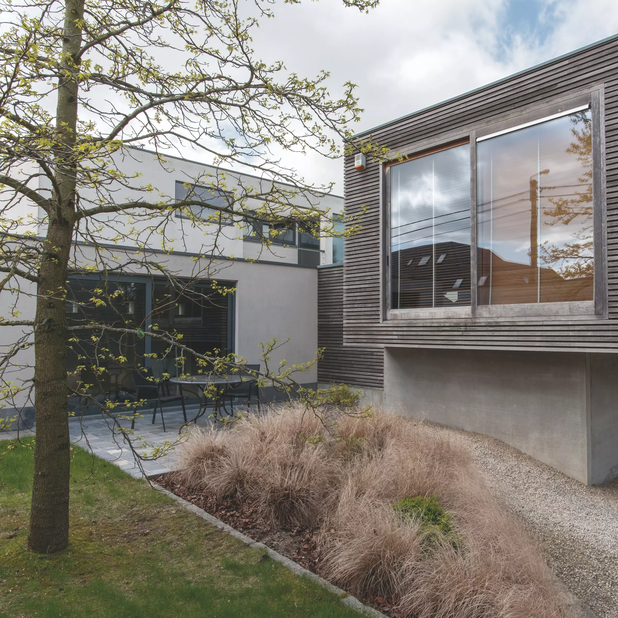 L'acquisition du terrain voisin permet de créer une cave et une salle de jeux pour les enfants dans un nouveau volume parallèle, raccordé au précédent par un passage vitré.