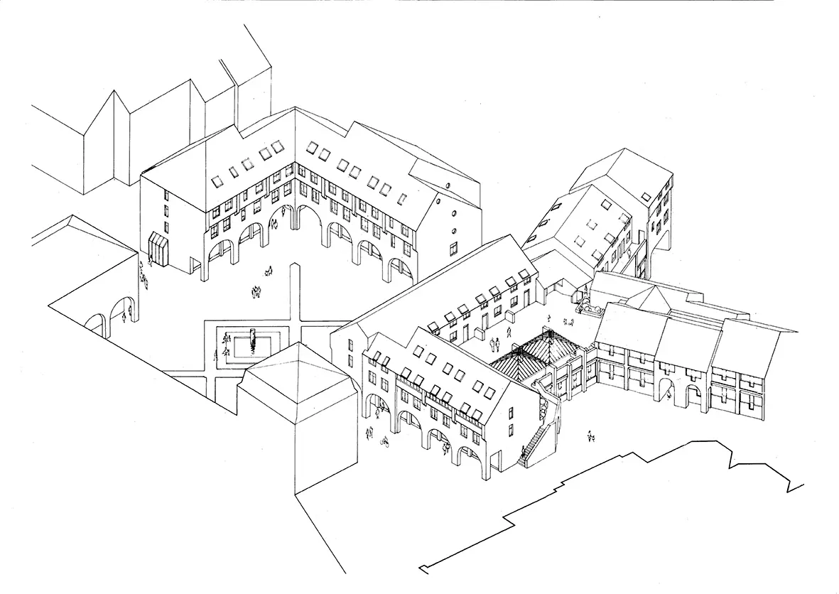 Le 3 septembre 1975, le professeur Raymond Lemaire présente l'esquisse du projet porté par AGUA : « un centre rénové pour Mouscron ». Ce projet est développé dans le cadre d'une planification entre l'État et les communes : des subsides allant jusqu'à 80 % du montant des travaux sont conditionnés à des critères de centralité, d'un foncier appartenant au public et d'un changement profond dans la manière de concevoir les centres urbains avec impact local et zone d'attrait régional. De 1969 à 1973, la Ville avait déjà porté plusieurs projets sur cette zone dans l'espoir de bénéficier d'une compensation d'État à la suite de la construction du port de Zeebruges. Le projet de 1975 s'affirme comme un changement radical, présenté comme l'une des premières opérations pilotes de rénovation urbaine en Wallonie. Le respect du tissu urbain spécifique à Mouscron caractérisé par la maison entre mitoyens de faible hauteur, un rythme et une modulation à la mesure de l'homme qui marche, le raccommodage du tissu urbain là où il est usé, sont les principes qui sont mis en avant par AGUA dans le prolongement de leurs propositions contemporaines pour Louvain-la-Neuve. Le projet a l'ambition de s'insérer par son programme, son implantation et les liens au réseau commercial existant. Le projet tente de synthétiser le vocabulaire d'une architecture de briques et la rationalité de la structure en béton. L'importance de la mixité est également mise en avant, elle est générée par une trame constructive de 5,40 m qui permet la superposition des parkings, des surfaces commerciales flexibles et des logements. Toute la rénovation est accessible uniquement aux piétons.