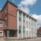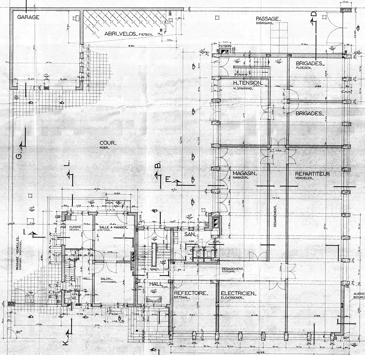 Située dans un quartier résidentiel, cette construction, caractéristique des équipements utilitaires de l'époque, se démarque par son gabarit imposant dicté par ses fonctions. Celles-ci déterminent les solutions différentes des façades et les choix de matériau. Les exigences du programme obligent – pour une partie du bâtiment – à utiliser des plateaux libres de toute contrainte. Des colonnes en béton bouchardé blanc sont donc disposées à l'extérieur sur toute la hauteur du volume. L'entrée est signalée par un auvent soutenu par une colonne de béton en cône inversé. Sur la paroi perpendiculaire à l'entrée, une grande composition décorative en céramique polychrome évoque l'histoire de la téléphonie et du télégraphe. Le hall d'entrée fait face à l'escalier et sépare le corps principal de la conciergerie.