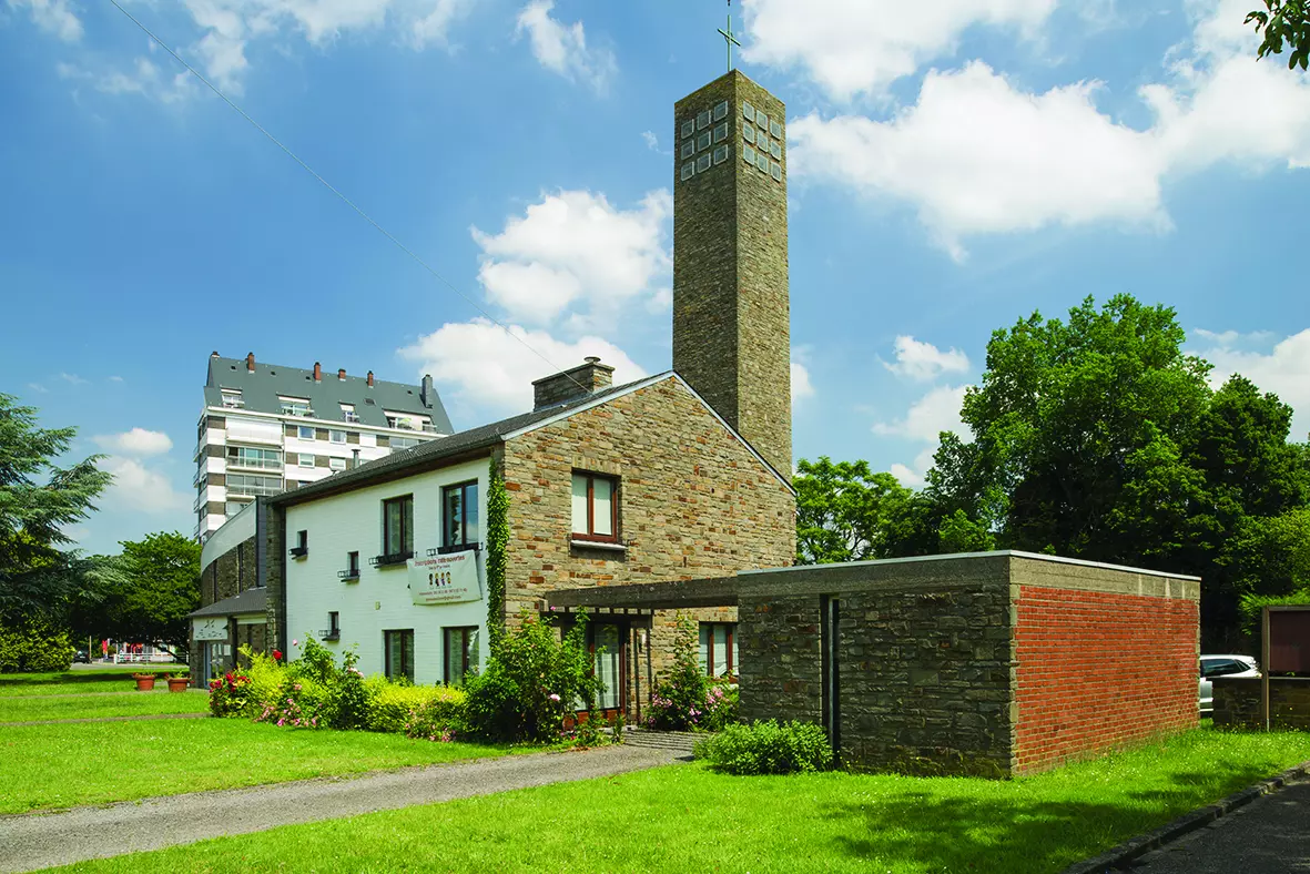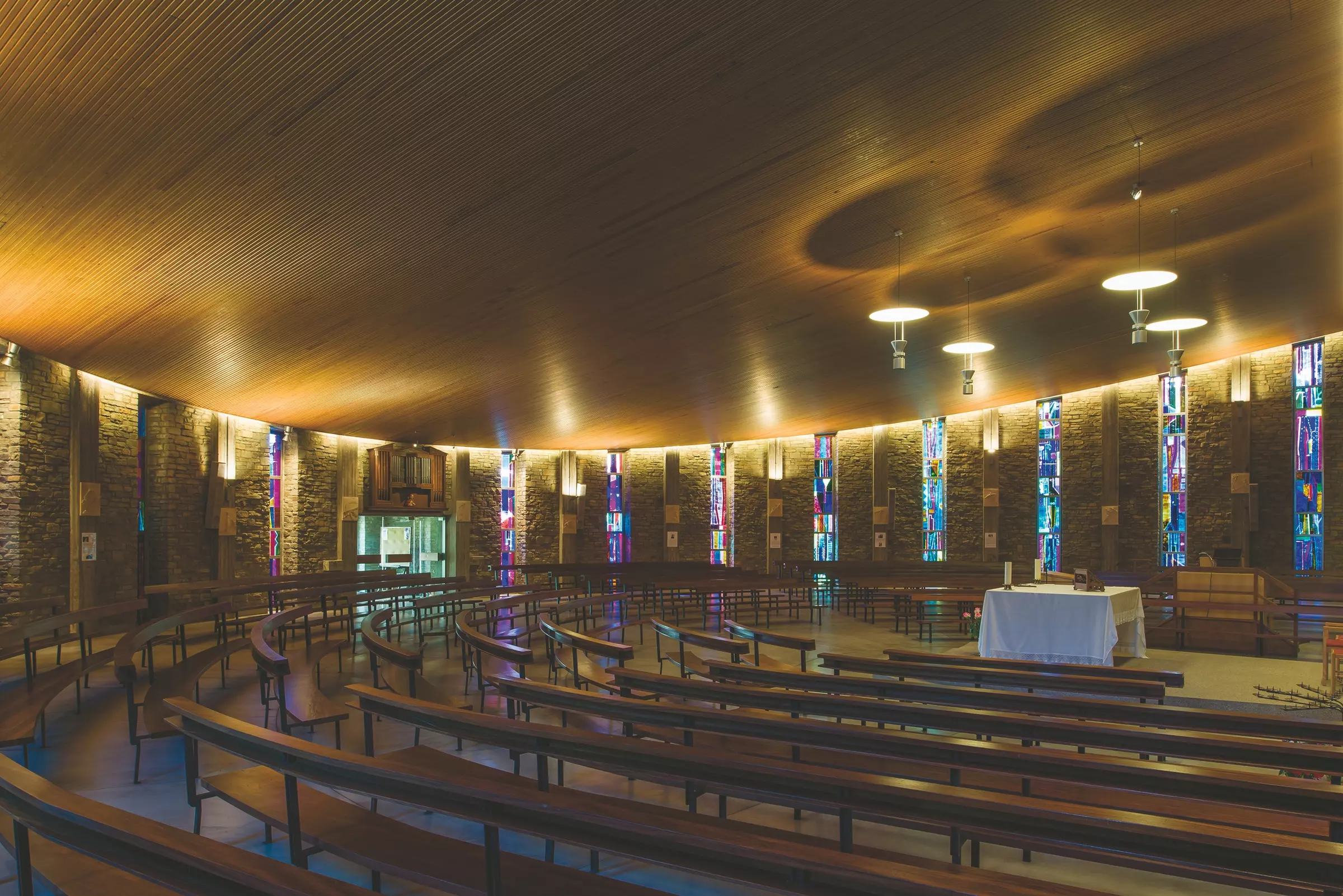 Instaurant la notion d'une assemblée physiquement participante, elle induisait une révision en profondeur de l'organisation spatiale des lieux de célébration. Le bâtiment est conçu ici sous la forme d'un volume semi-circulaire en grès ceinturé d'une épaisse poutre de béton apparente, et dont le diamètre avoisine les 30 m.