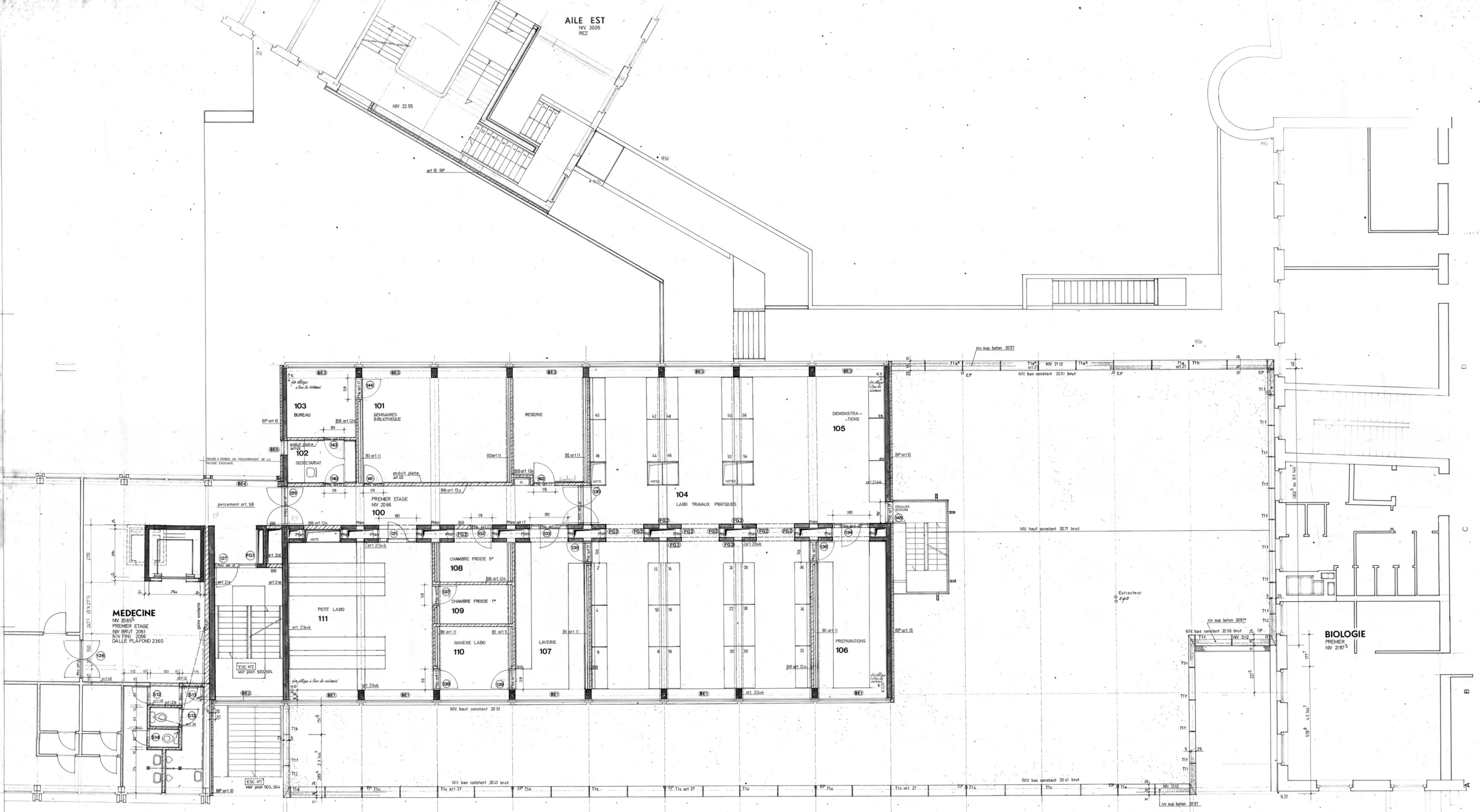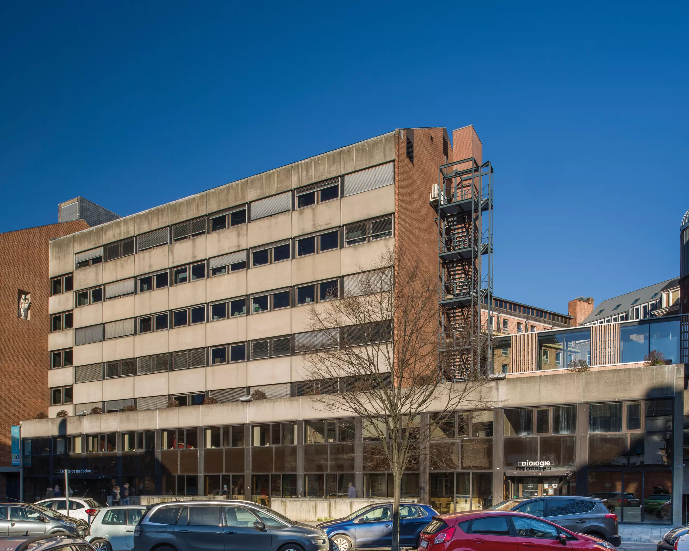 Le projet est composé de deux volumétries. Tout d'abord, la partie haute, abritant des laboratoires. Elle adopte une écriture de façade similaire aux autres bâtiments facultaires construits à cette époque : fenêtres en bandeaux et allèges en béton préfabriqué. L'élévation est placée en retrait de la rue et mitoyenne d'un seul côté afin de dégager un espace sur le côté de son pignon est. De la sorte, le soleil pénètre à l'intérieur de l'îlot et évite de le refermer davantage sur lui-même.