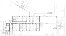 La deuxième volumétrie est la partie basse, composée de deux niveaux abritant des auditoires, une agora intérieure ainsi que des bureaux. Sa façade est caractérisée par un grand mur-rideau aux vitrages foncés imprimant les reflets de la cathédrale.