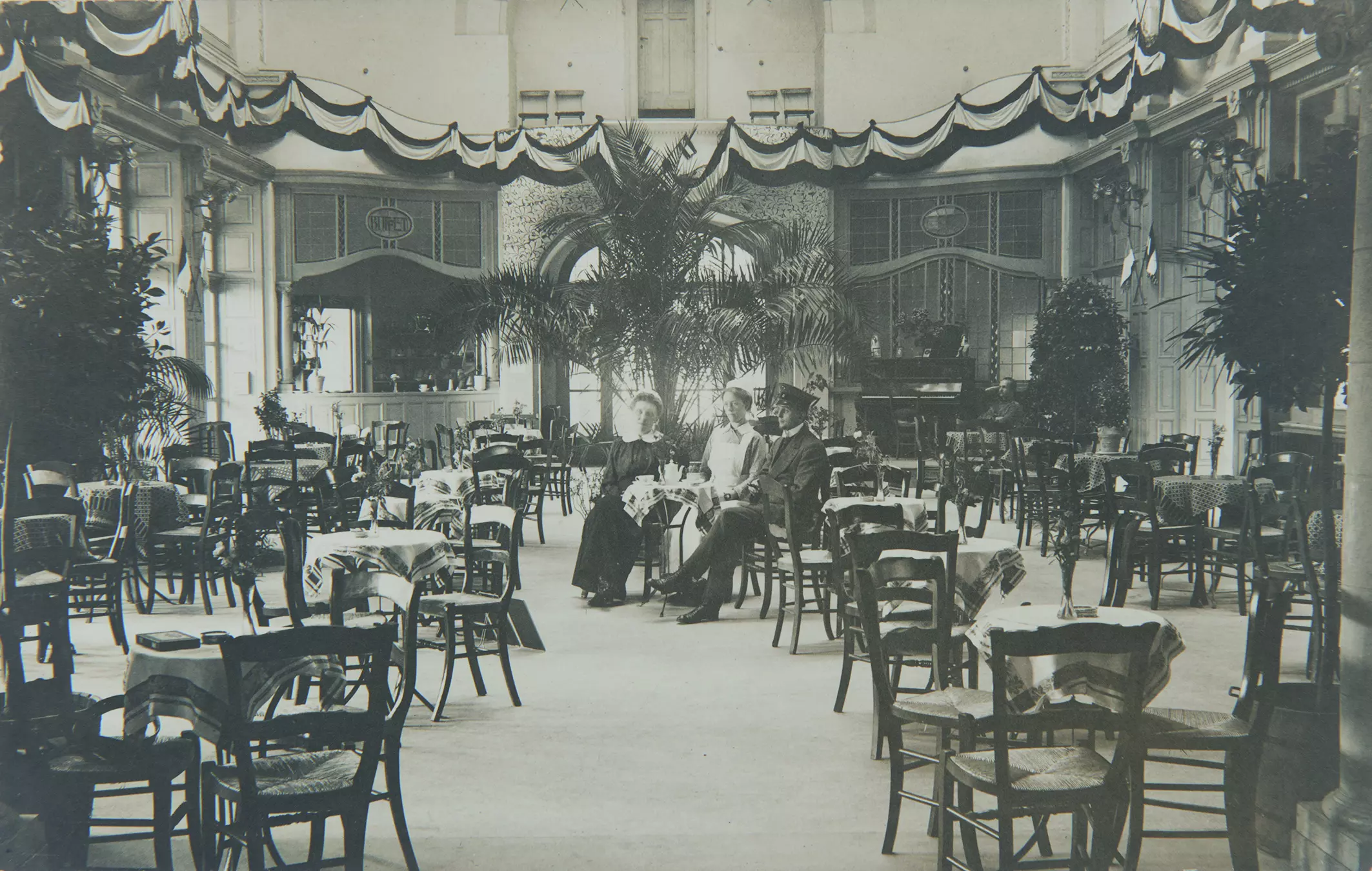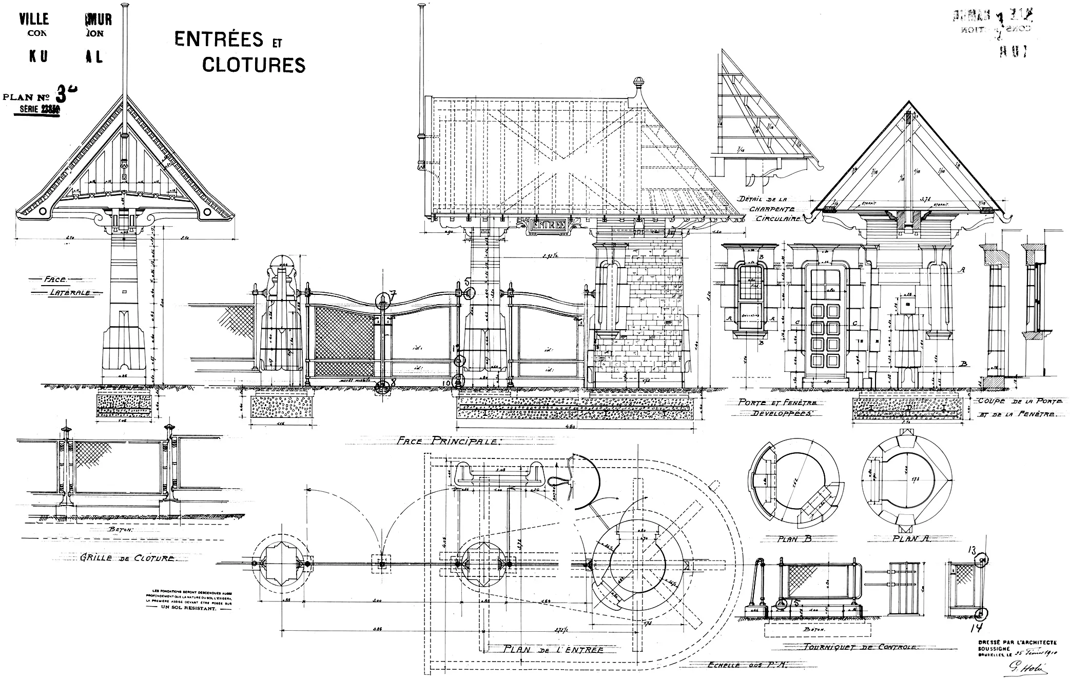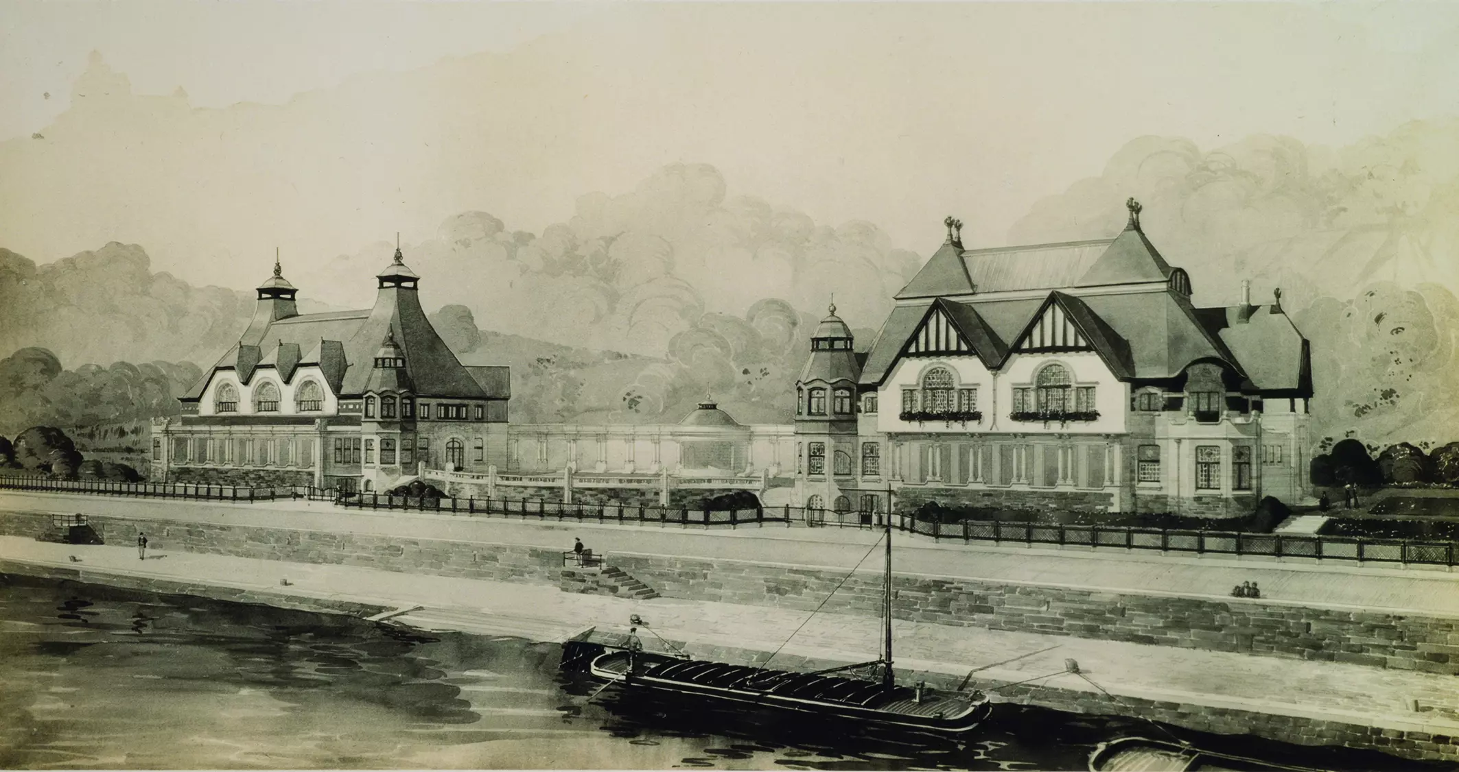 Les bâtiments A et B (détruit) sont clairement structurés en façade par de larges baies vitrées, et en volume par les impératifs de grandes salles ceinturées de galeries, fumoirs et autres espaces de distribution. L'architecture est pensée comme fonctionnelle et modelée pour être vue depuis la Route Merveilleuse comme depuis la rive. Le langage décoratif, avec terrasse couverte rythmée de doubles colonnes, tourelles et clochetons, avancées percées de serliennes et toitures très étudiées avec épis de faîtage aux profils graphiques plutôt « hankariens », correspond à la réputation de Hobé d'être maître dans l'art de couronner un édifice.