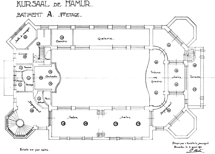 Pour remplacer le premier Kursaal construit par Jean-Joseph Naert en 1880, inadapté et devant laisser place au boulevard Isabelle Brunell réapproprié, Georges Hobé tient compte de la conjonction entre bord de Meuse et départ de la Route Merveilleuse, dans le petit parc au droit de l'ancienne porte de La Plante, pour concevoir, dans un premier temps, un bâtiment monumental dominé par une tour et intégrant une vaste terrasse au-dessus de l'avenue connectant directement les salles de spectacle à la Meuse. Jugé trop cher, ce projet est remplacé par un agencement de deux bâtiments moins volumineux de part et d'autre d'une esplanade ouverte vers l'eau et fermée côté Citadelle par une galerie couverte avec kiosque à musique sur l'axe transversal.