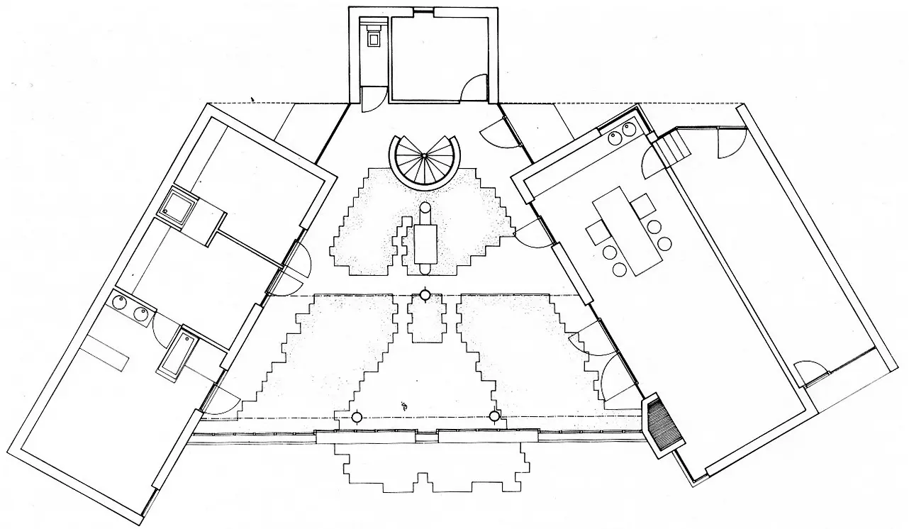 Lovée dans un écrin d'arbres, la maison s'ouvre par ses deux ailes (jour-nuit) comme des bras vers le soleil. Un troisième bloc vertical forme le pivot et contient un espace de bureau juché sur des fonctions de services.