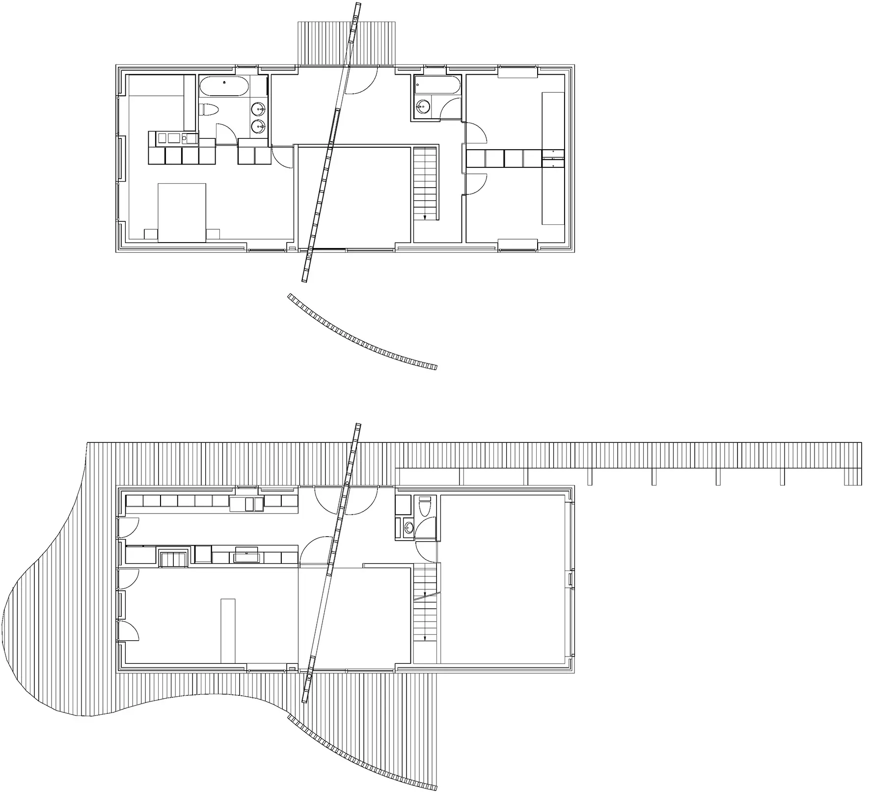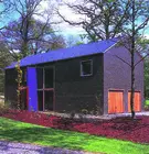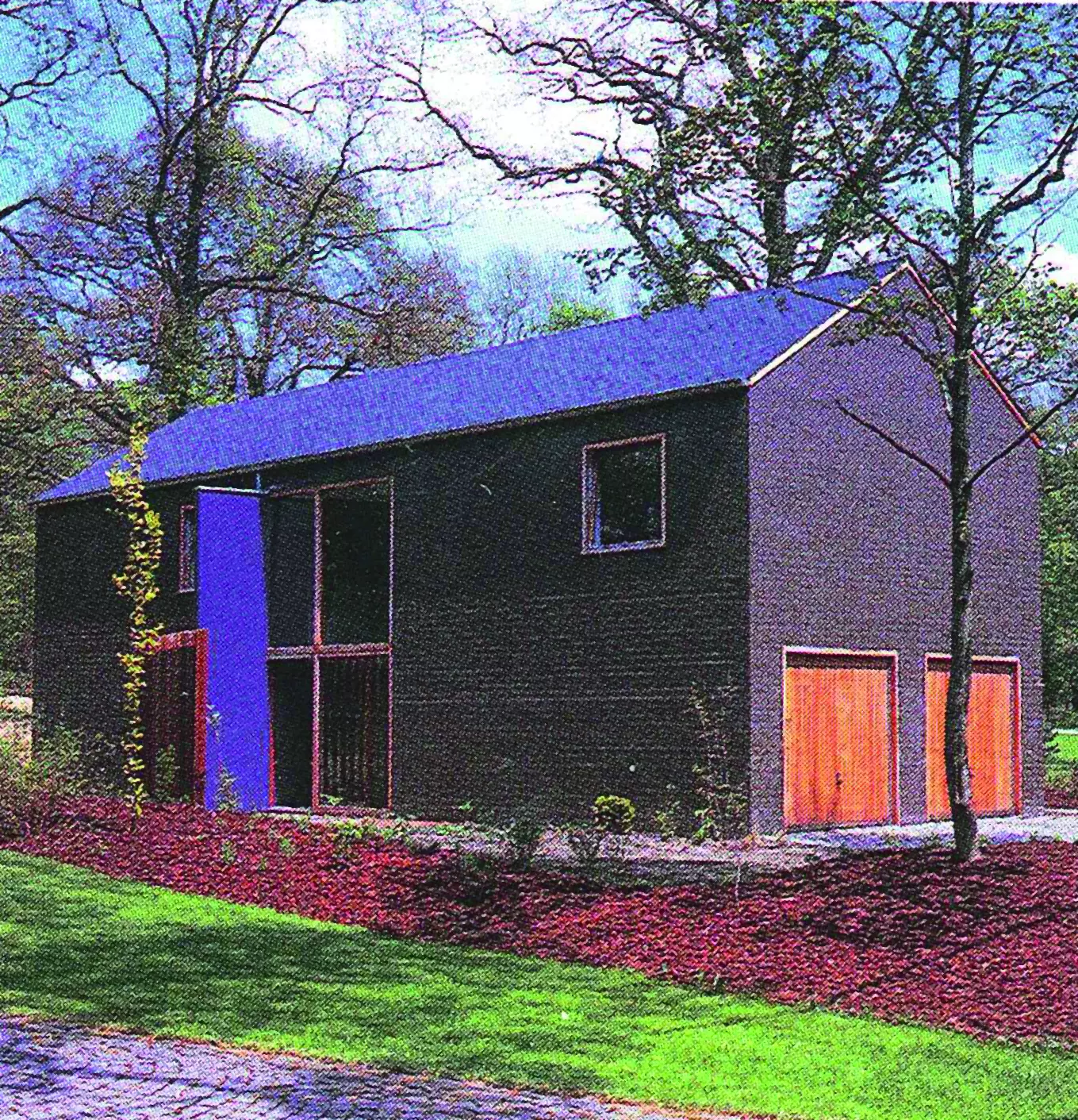 Disposée perpendiculairement à la rue, en léger retrait, cette maison de briques foncées se compose d'un volume de deux niveaux coiffé d'une toiture à deux versants. Un mur oblique la traverse de part en part, selon un axe est-ouest qui définit les fonctions, oriente les regards et génère une continuité entre intérieur et extérieur. Les deux faces de cette paroi sont peintes de couleurs différentes, en mauve et rouge, symbolisant l'Orient et l'Occident. L'intimité des occupants est assurée par la végétation, le relief du terrain, des ouvertures latérales limitées et une paroi courbe en bois qui protège la terrasse des regards.