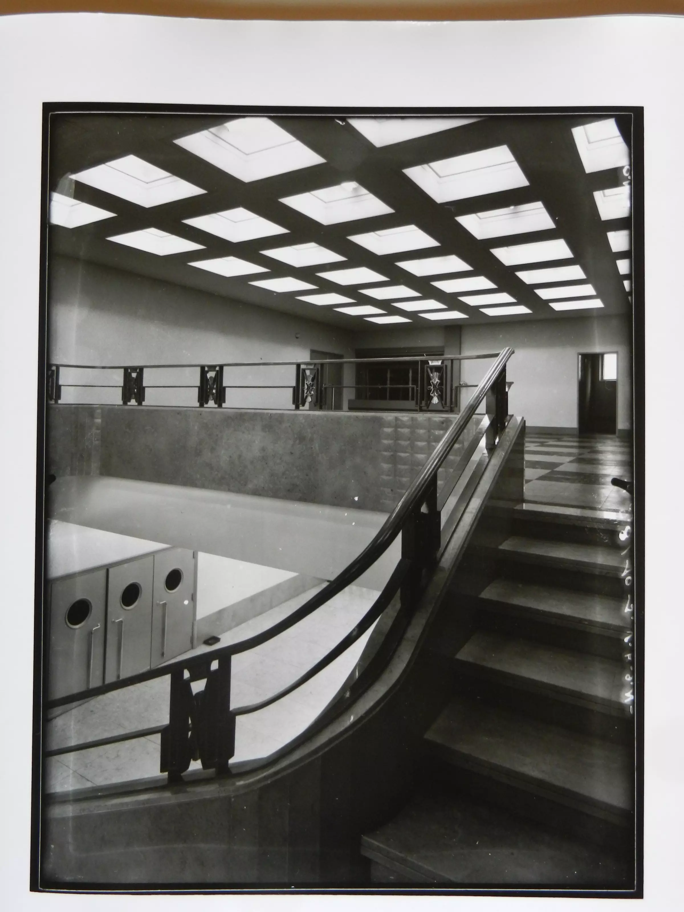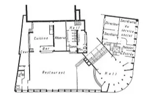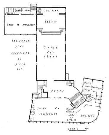 La salle des fêtes ainsi que la salle de gymnastique et son esplanade prennent place à l'arrière. Bien qu'il soit pratiquement contemporain de la cafèterie Chat Noir, le bâtiment s'en distingue, à l'extérieur comme à l'intérieur, par un modernisme emprunt de monumentalité, plus typique des projets de jeunesse de l'architecte, alors marqué par l'enseignement de son maître Joseph Moutschen.