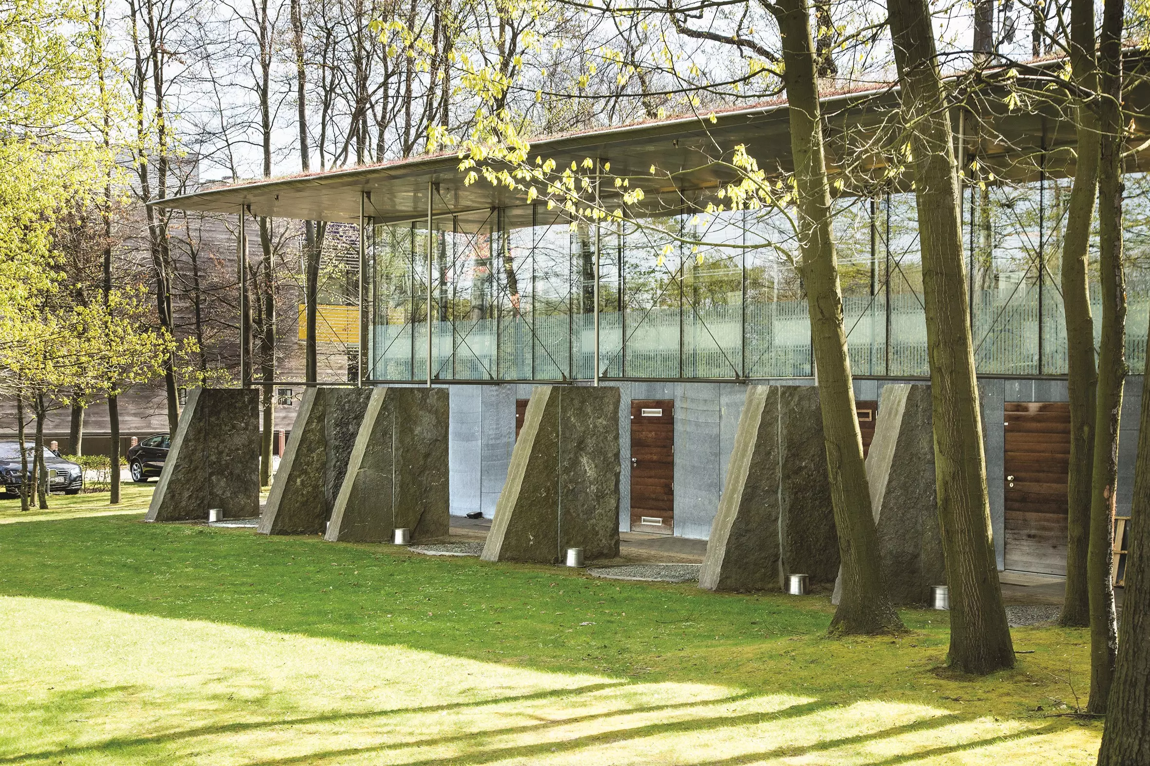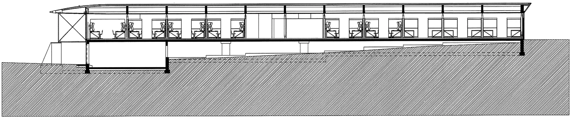 Pour assurer la stabilité de l'édifice, l'architecte a développé une structure en lamellé-collé, qui se distingue par l'emploi de très fines colonnes taillées en pointe en leurs base et sommet. Les efforts latéraux sont repris par des contreventements en inox implantés à l'extérieur. Le bâtiment est ouvert sur le paysage, intégrant l'usage du bois dans sa réalisation et, surtout, d'une grande toiture végétale débordante, destinée à réguler l'apport calorifique du soleil, le régime des précipitations et leurs nuisances sonores.