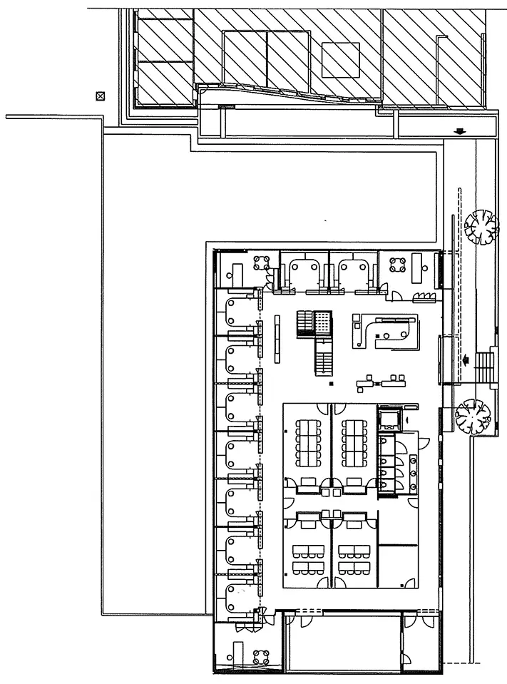 Le second se pose sur le premier, en porte-à-faux ; jouant de la déclivité, il donne accès latéralement à l'entreprise. Il se développe sur deux niveaux, son gabarit respecte l'échelle humaine, le bâti voisin et le dense couvert végétal tout proche. Il est bardé de bois, matériau choisi par souci d'intégration. Les baies vitrées, orientées au sud-ouest, sont protégées par des pare-soleil.