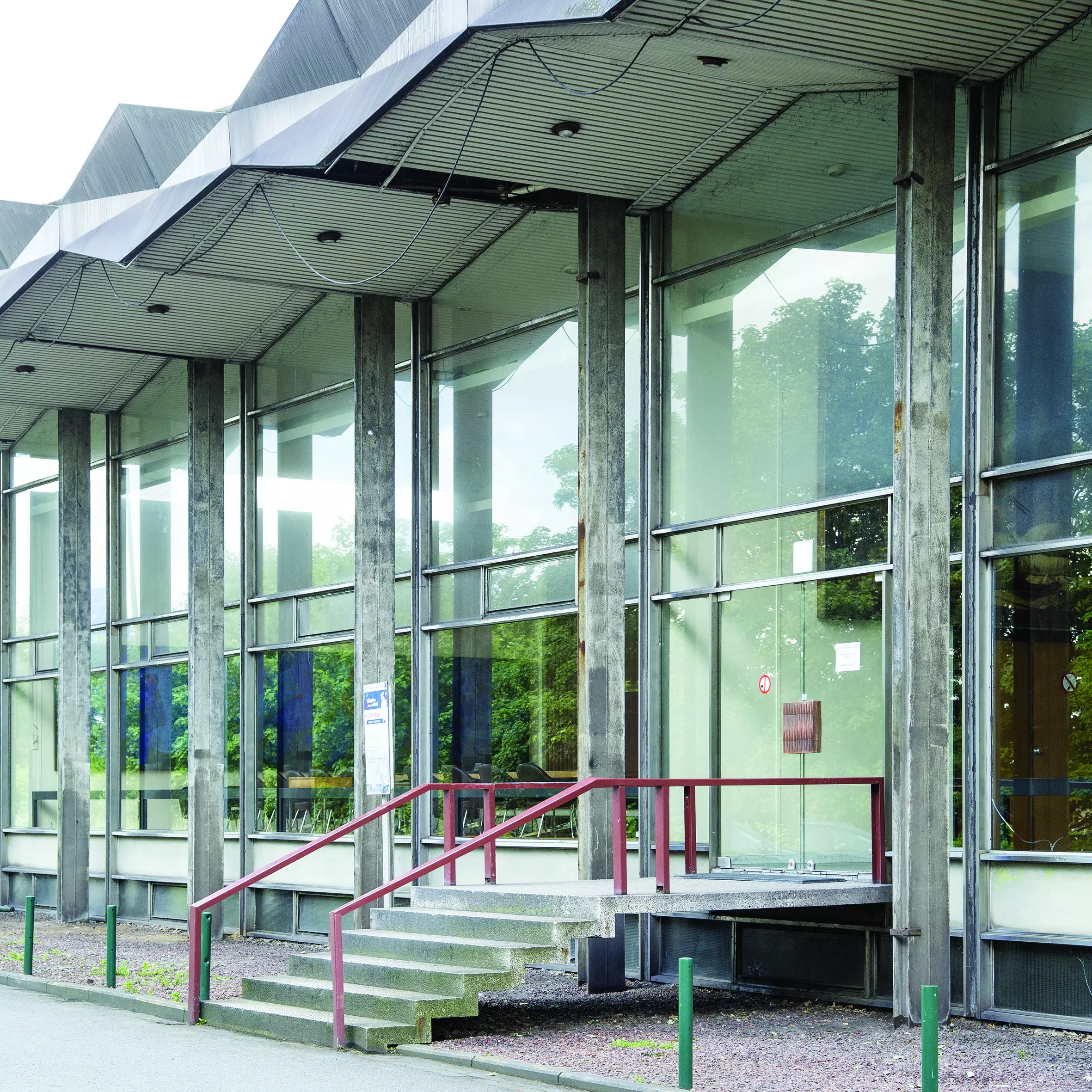 Légèrement rehaussé par rapport au niveau du sol et offrant un bandeau continu de vitrage sur les quatre façades décollant la toiture, il donne légèreté à l'ensemble, bien que sa stature soit imposante. Lieu du débat démocratique et de la vie collective, il incarne la fonction par transparence, ouverte sur les alentours. Une rampe de marches en béton armé mène à l'accès principal, qui termine sur un mince palier donnant accès au hall d'accueil et d'attente.