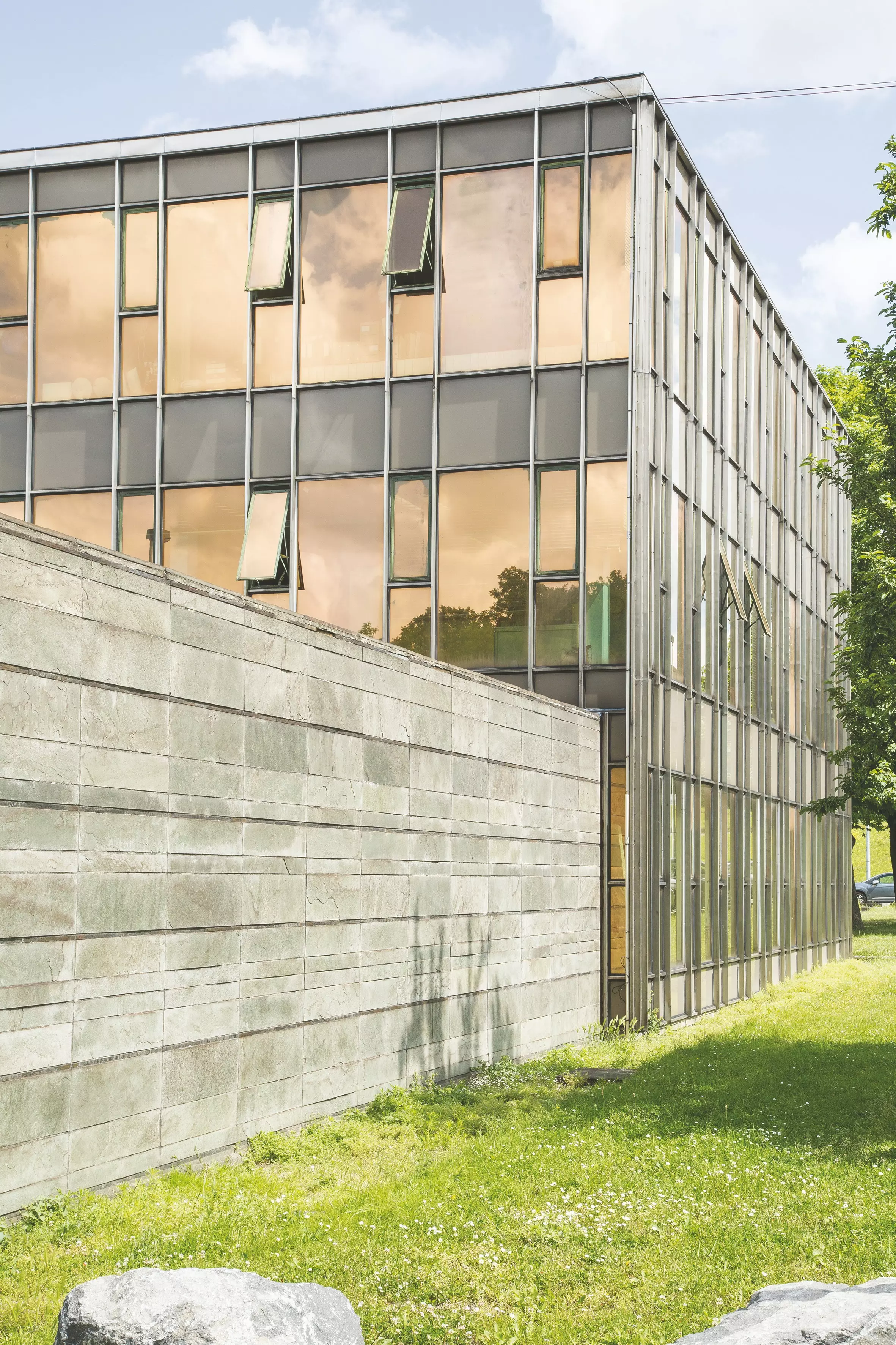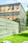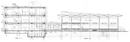 Le bâtiment administratif se révèle, par contraste, plus conventionnel et rationnel dans ses articulations. Parallélépipède de trois niveaux, sa structure est en béton armé. L'habillage extérieur est réalisé avec un mur rideau en aluminium anodisé avec des châssis opaques et réfléchissants, de ton bronze, alternés par des panneaux de remplissage bruns. Entre les deux corps, un petit volume de liaison bas permet d'accueillir le public et de l'orienter vers les différents services.