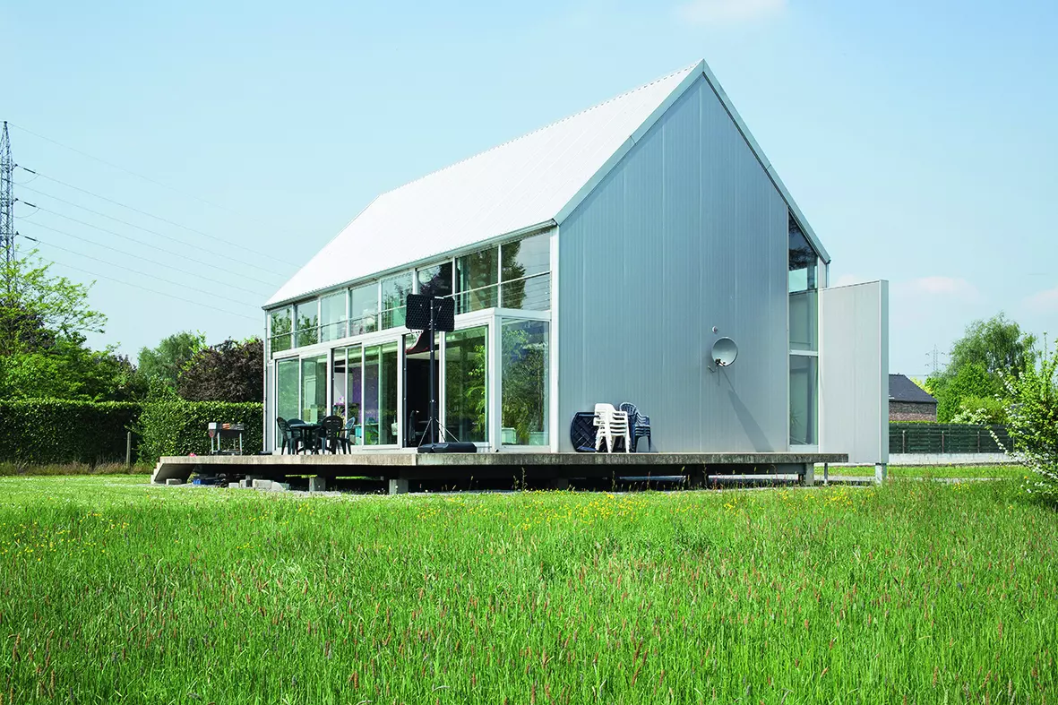 La maison s'implante dans un environnement semi-rural. Sa proximité avec la Meuse et la nature occasionnellement inondable du site ont fixé la base du projet : une structure de pilotis et de dalles de béton. L'acier et l'aluminium ont été choisis structurellement et pour habiller le bâtiment, lui donnant un aspect industriel, actuel et travaillé.