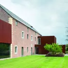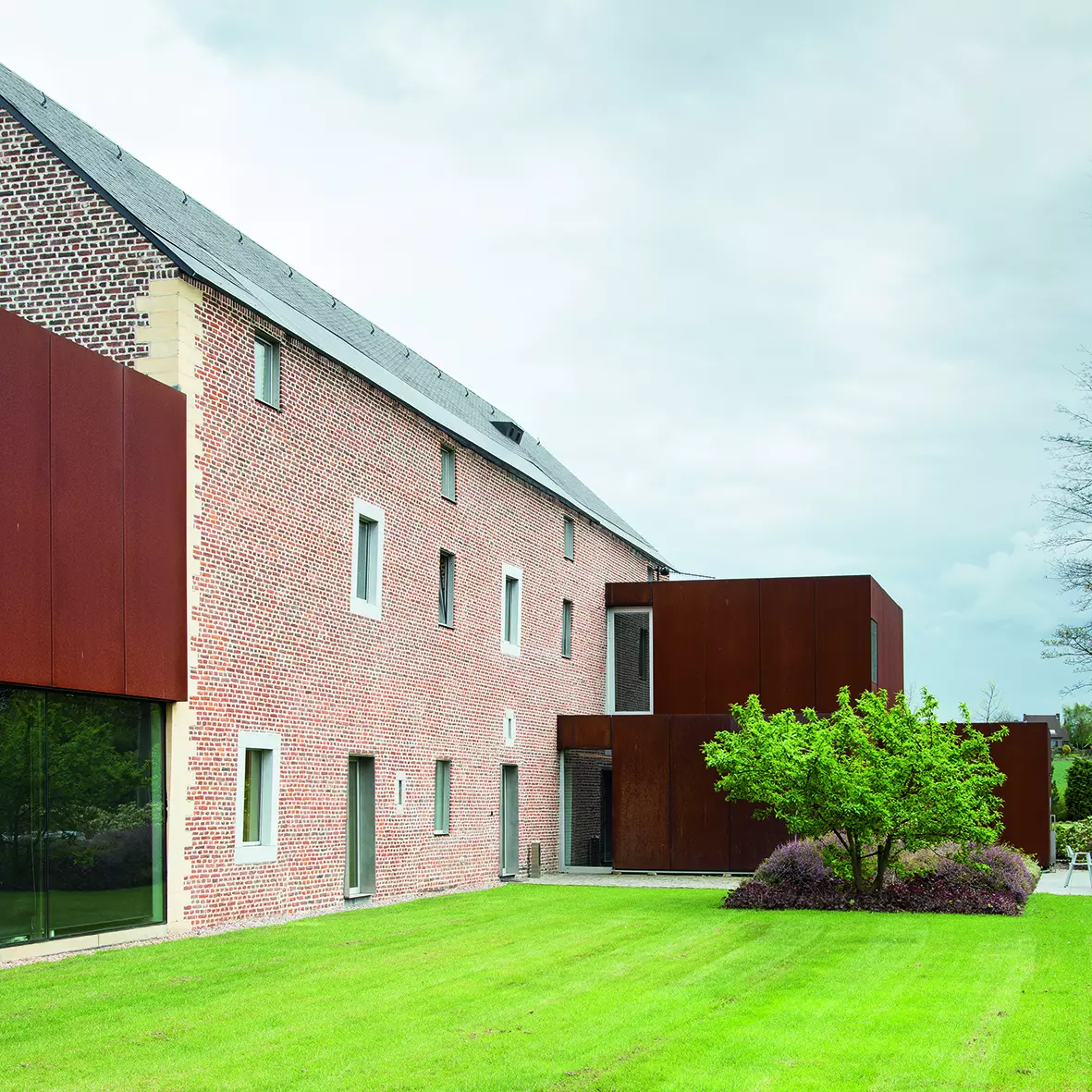 Une ancienne ferme en carré, aux volumes simples, a été réaffectée en bureaux d'une agence de communication. L'intervention se devait d'être modeste afin de respecter le caractère du lieu, qui avait été préservé jusque-là. Pour permettre à l'entreprise de s'épanouir dans ses nouveaux locaux, un bâtiment parallélépipède a été construit de manière à relier deux volumes existants, aux gabarits différents. Des percements discrets et contemporains ont été faits au niveau des toitures et des façades pour augmenter l'apport de lumière naturelle dans les espaces intérieurs, sans dénaturer l'identité des lieux. Dans le même esprit, l'ensemble a été isolé également par l'intérieur, améliorant ainsi la qualité thermique en évitant de modifier les façades.