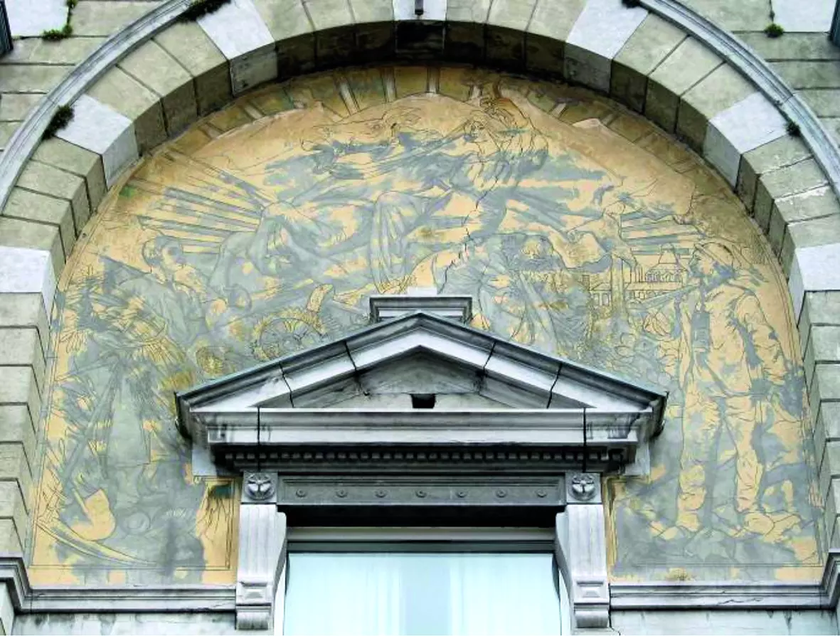 À l'avant-corps, sous l'arc central de décharge, le remarquable ensemble de sgraffites est l'œuvre de Paul Cauchie, principal représentant de la technique en Belgique : au centre figure le « Triomphe du travail », encadré de part et d'autre par deux médaillons circulaires honorant César De Paepe et Alfred Defuisseaux, fondateurs du Parti ouvrier belge (POB) en 1885.