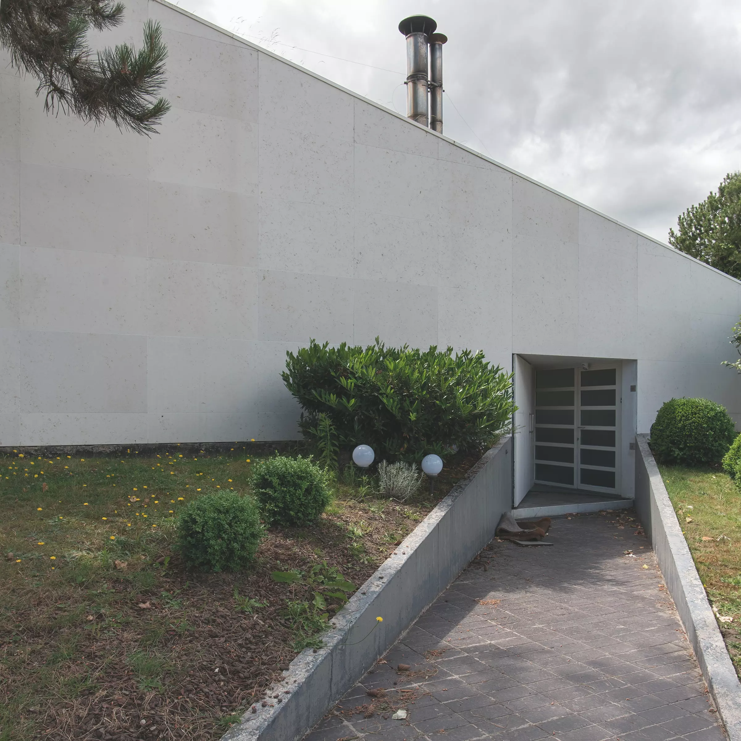 Partiellement enterré, elle est couverte d'un unique pan de toiture végétalisée, remodelant la topographie des lieux. Commandée par le frère de l'architecte, cette maison illustre bien la tendance postmoderne de l'époque. On y retrouve une géométrie minimaliste, des lignes franches, un aménagement sobre et dépouillé de tout élément superflu.