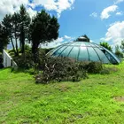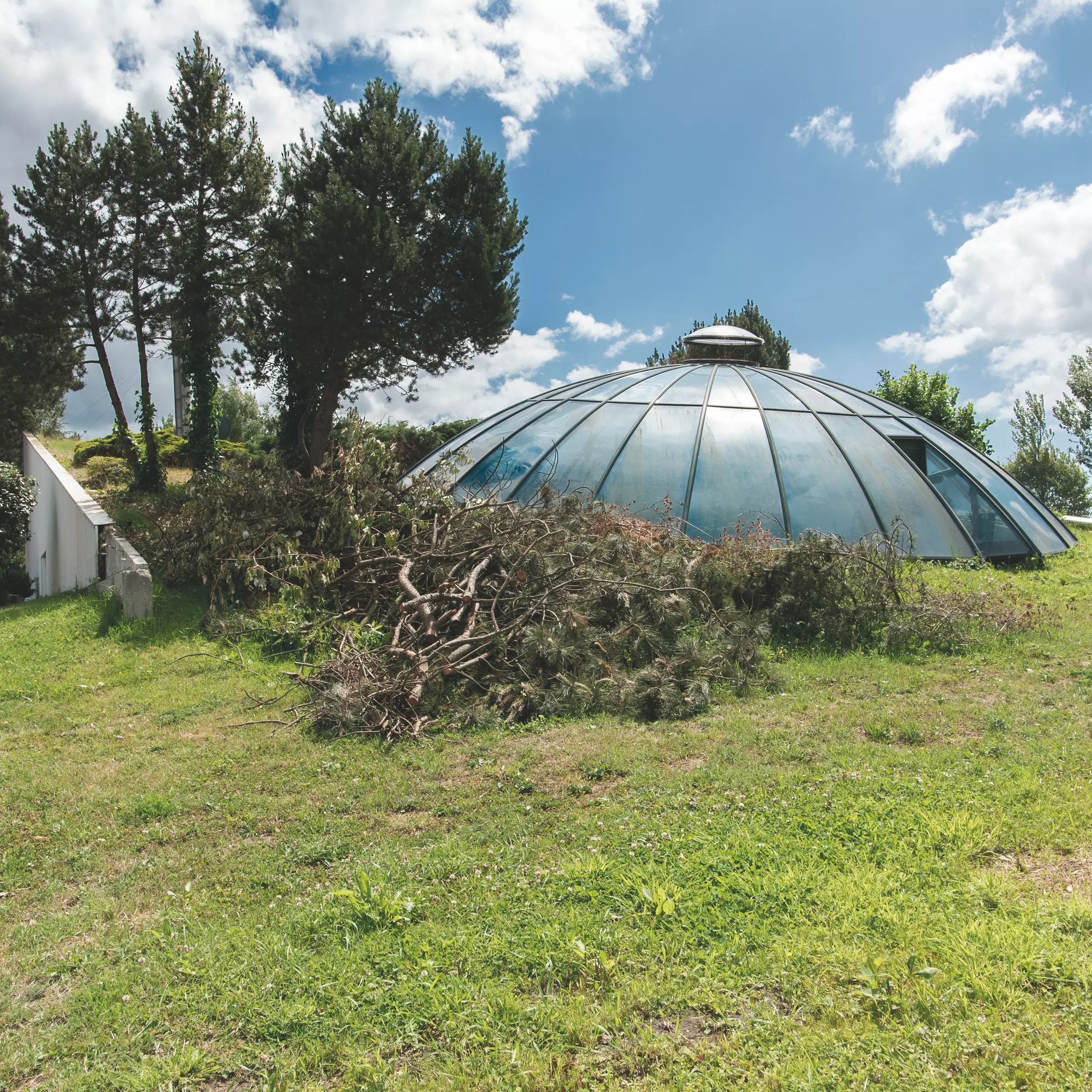 Entièrement faite de béton et de verre, la maison tient sur ses deux murs latéraux, dégageant en son sein un vaste espace baigné de lumière. Tout élément structurel y est proscrit, les fonctions s'enchaînent en toute fluidité. L'ampleur de la toiture permet, en outre, de développer sur une double hauteur la façade vitrée du séjour. La grande coupole, absente du projet originel, a été ajoutée par la suite.
