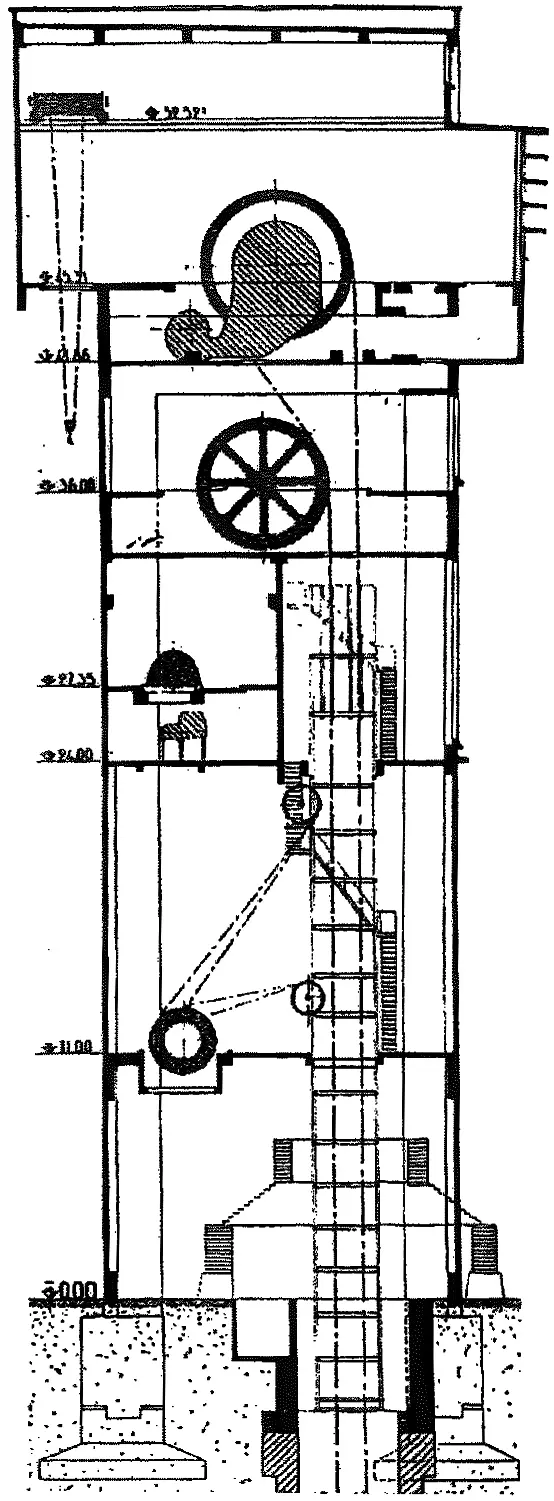 Le Service architecture de la société Évence Coppée et Cie opte pour la construction d'un chevalement en béton armé avec machine en tête plutôt qu'un châssis métallique. Cette solution offre plusieurs avantages : économie de place (la recette se trouve à l'intérieur de la tour), inoxydation, suppression des vibrations et prix de revient moindre.