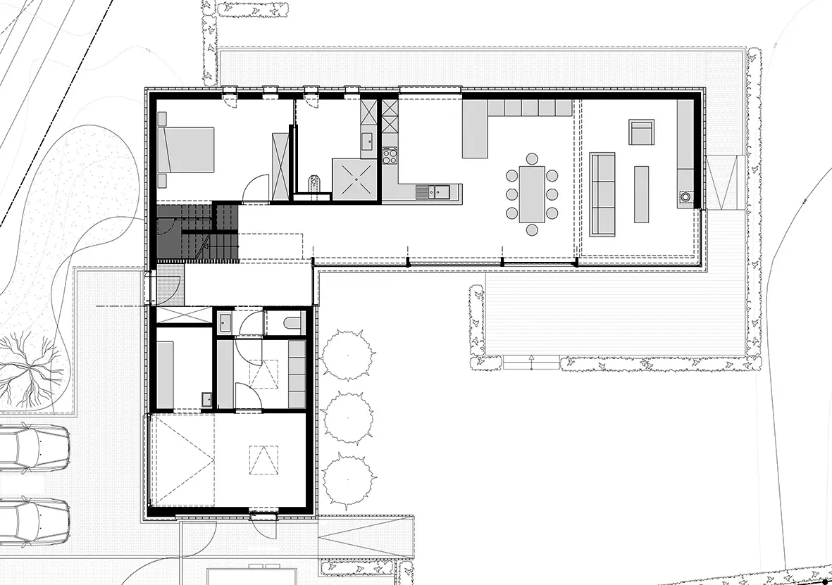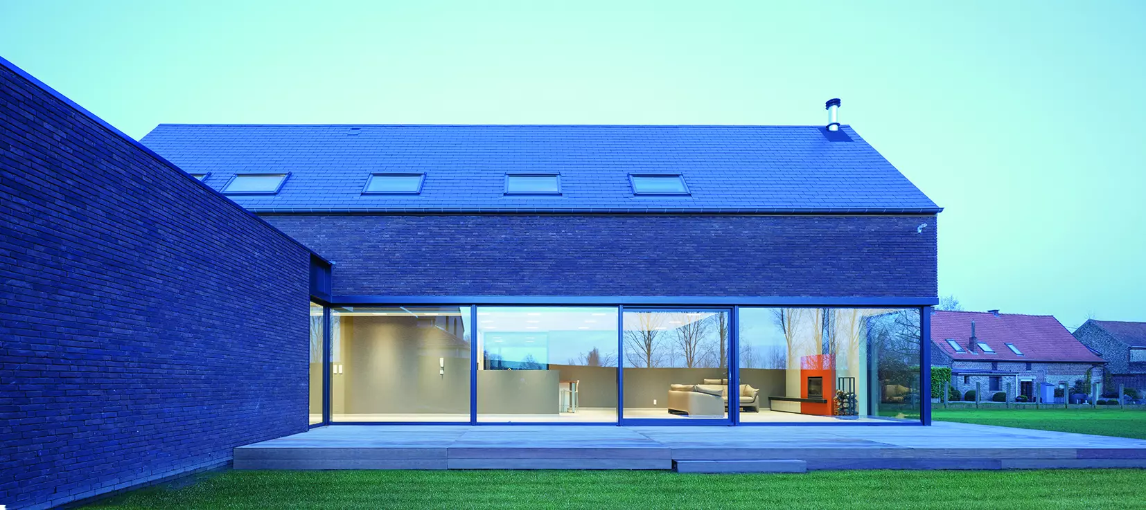 Située en zone rurale, cette maison affiche sa contemporanéité par une épuration à l'extrême de la typologie traditionnelle de la ferme. L'architecte Vermeersch parvient à intégrer un projet actuel dans le contexte et dans l'esthétique du village en privilégiant les formes habituelles de la maison avec pignons et corps de logis. Le volume entame ainsi le dialogue avec ses voisins, sans tomber dans le pastiche. La sobriété de l'écriture se retrouve également dans la simplicité du plan et dans le traitement des formes. Réduite à l'essentiel, la structure est proche du minimalisme. En façade, la répartition raisonnée des pleins et des vides tisse des relations privilégiées entre le volume et son environnement. Les grandes baies marquent la continuité entre intérieur et extérieur, laissant deviner un espace clair et transparent en dedans, et formant autant de tableaux sur le paysage pour les habitants.