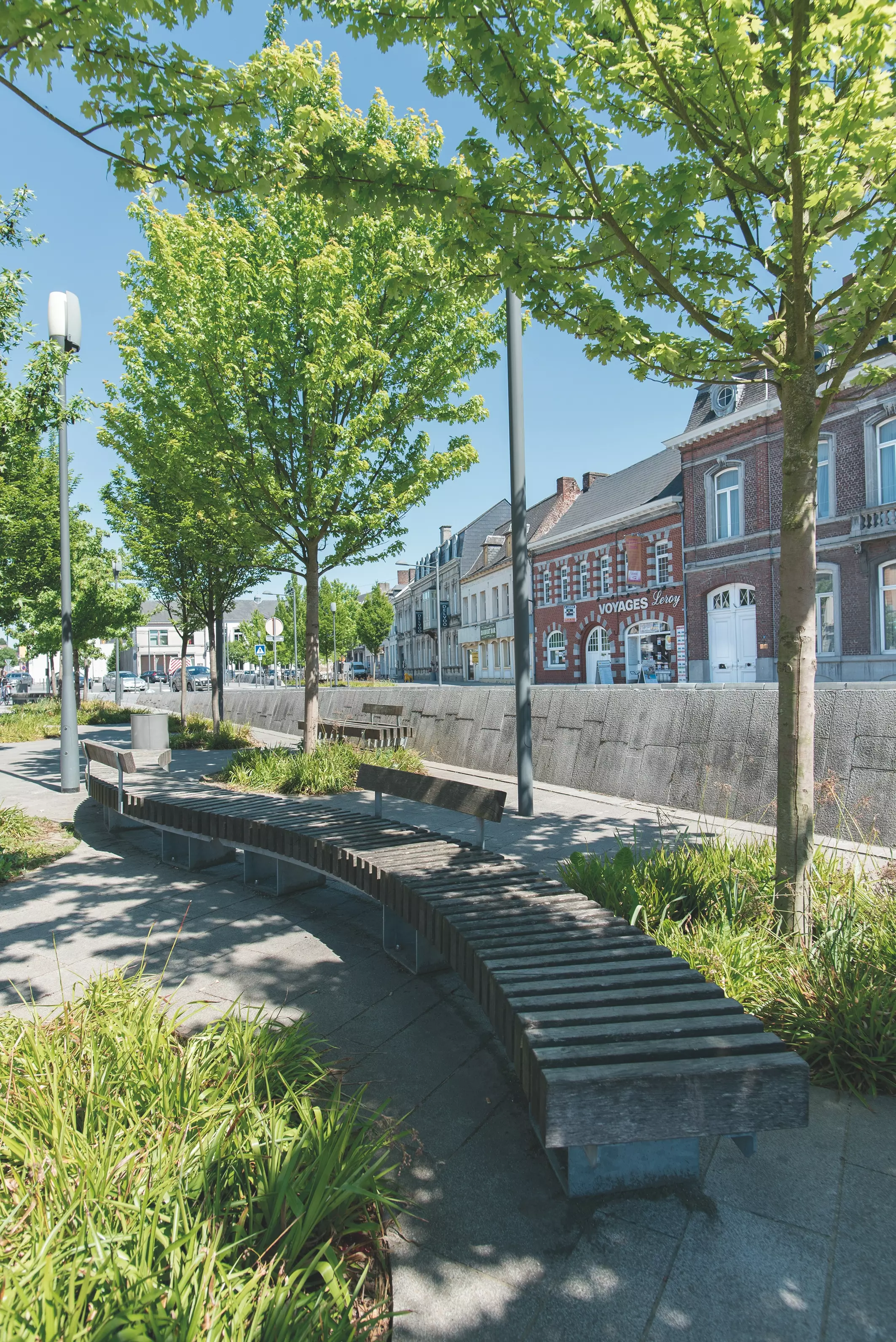 Les zones de convivialité sont agrémentées de bancs en bois faits sur mesure. Cette matière apporte un aspect plus chaleureux et crée une intimité, que l'on retrouve dans la constitution de zones vertes bien délimitées, évitant un aspect trop minéral. La volonté de redonner une place importante aux usagers lents et la polyvalence du site débouchent sur des expériences intéressantes. Le parking en pavés porphyre peut ainsi disparaître au profit d'un espace forum ou de spectacle. Automobilistes ou piétons, les perspectives varient en fonction de la localisation ou du moyen de déplacement. Les jeux de matières et de lumières se décuplent à l'infini selon les saisons et le climat.