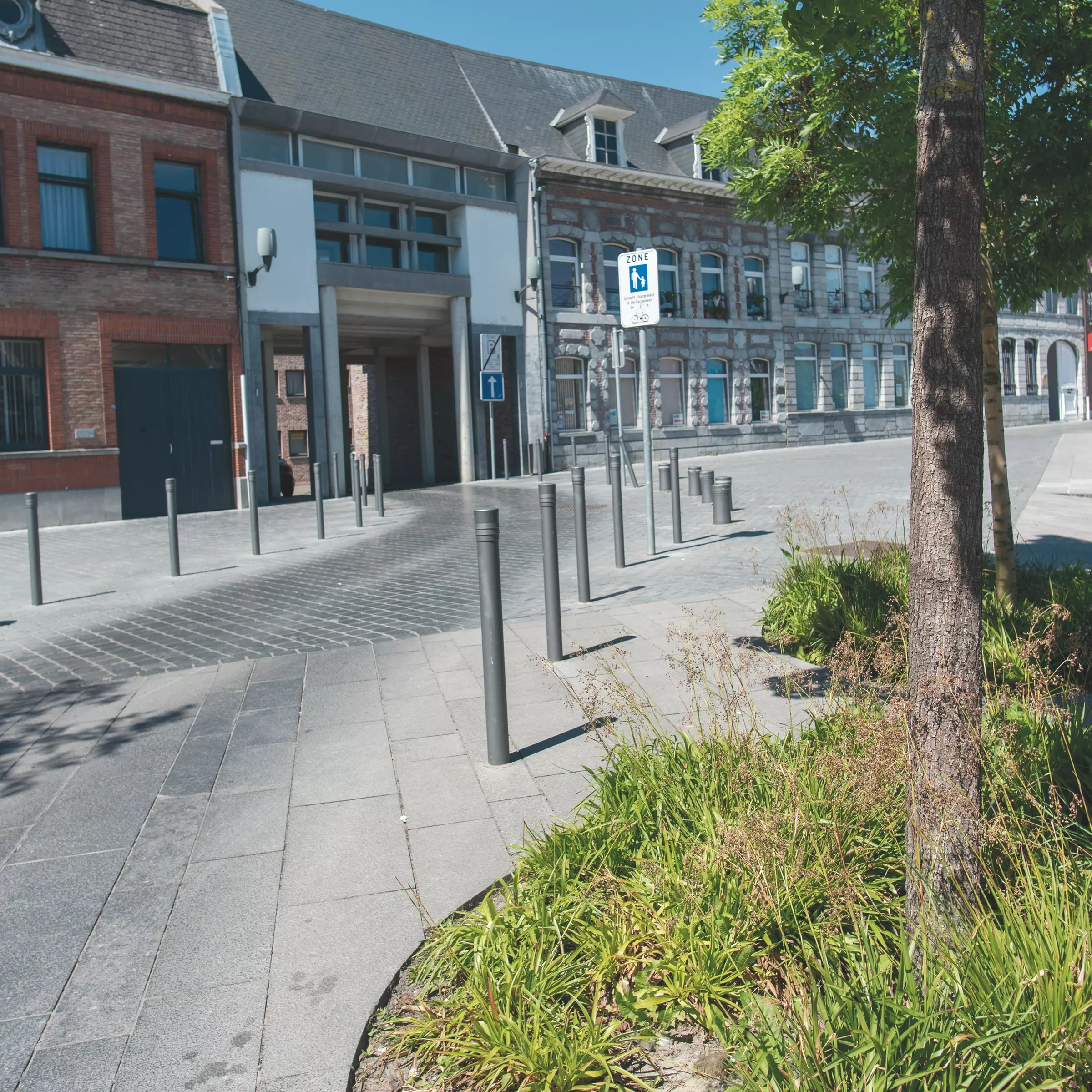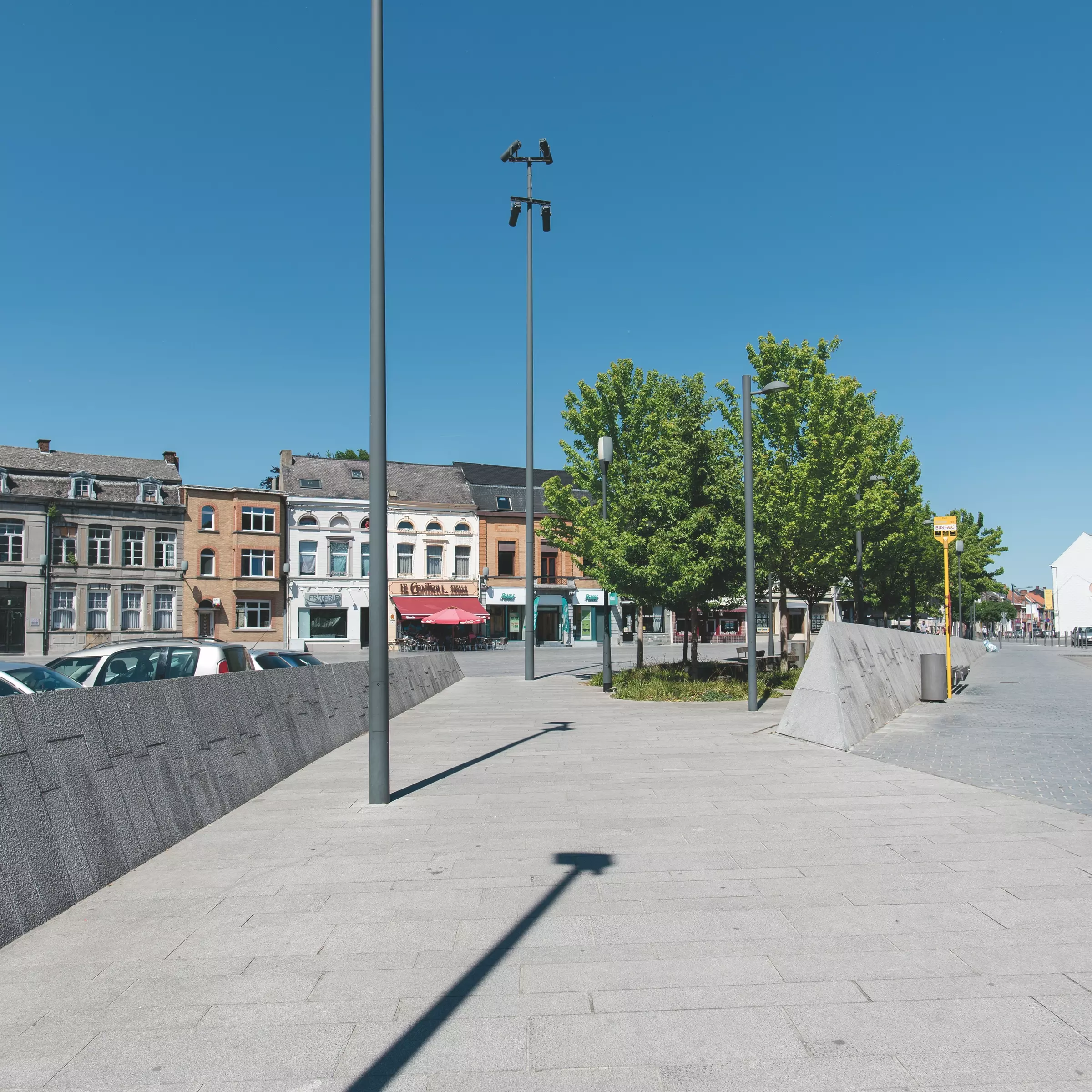 L'association momentanée ABR-ADEM parvient à concevoir un espace unitaire en répondant à ces différentes volontés. La cohérence de leur proposition passe par un vocabulaire et des matériaux simples. Les pavés de pierre bleue naturelle sont privilégiés dans les parties de détente, lesquelles sont séparées des endroits fonctionnels (parking, passage des véhicules, attente des bus ) par des murets en pierre bleue piquetée.