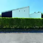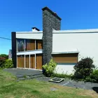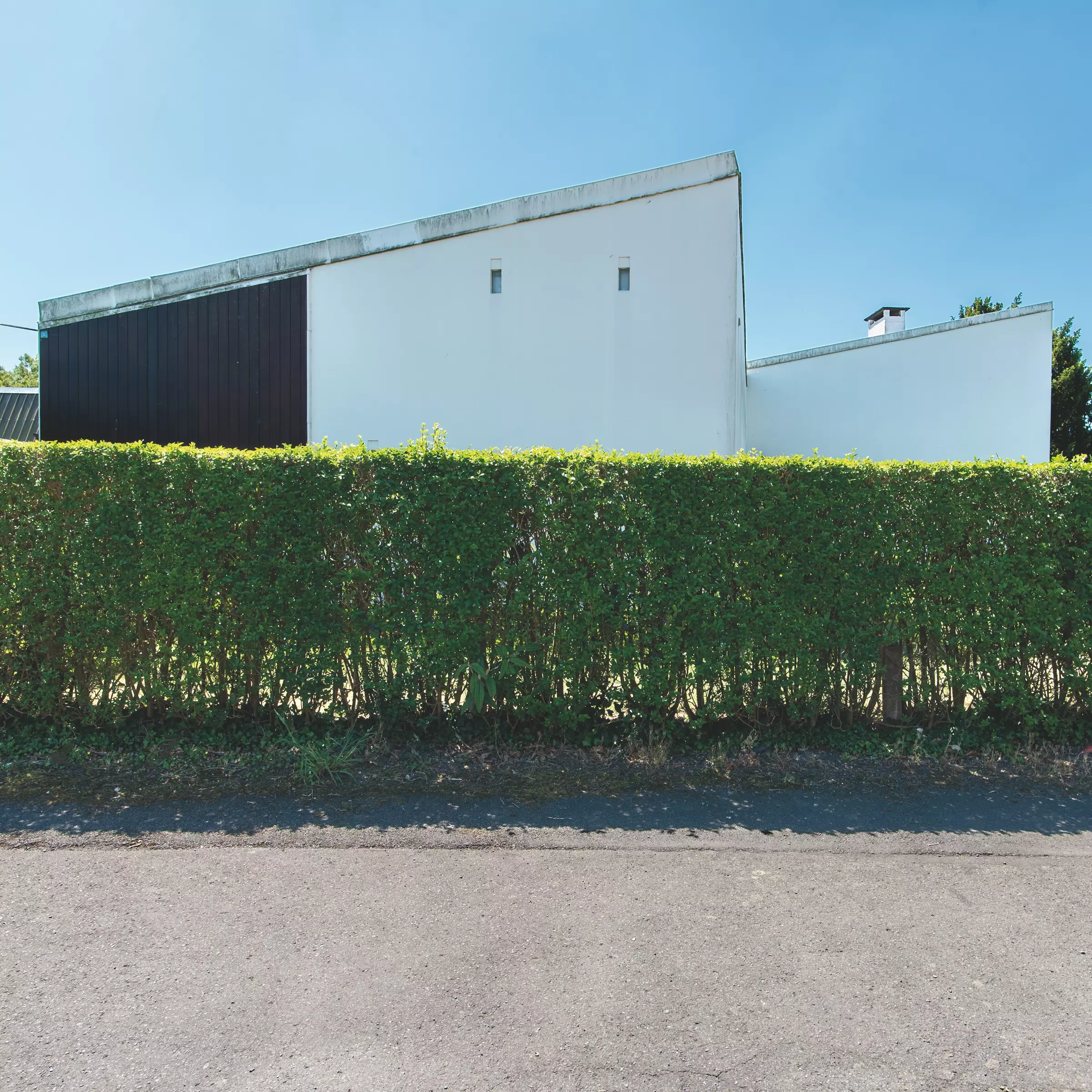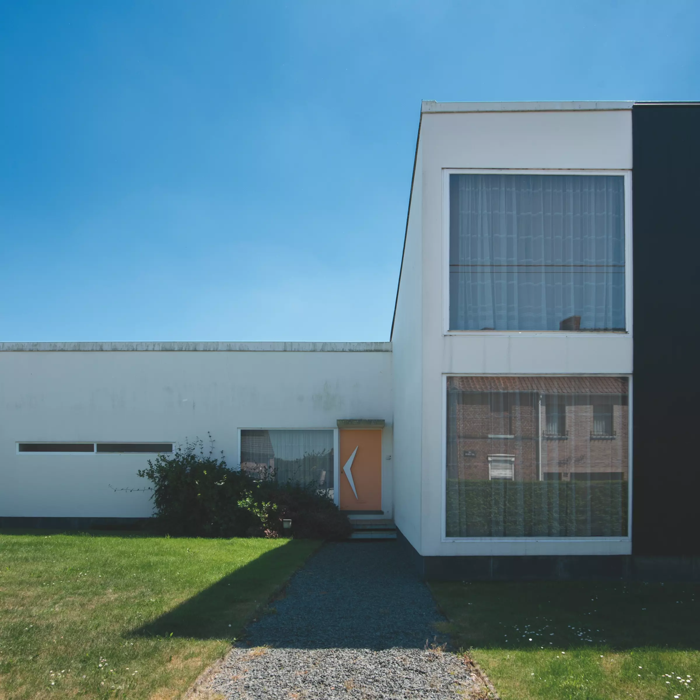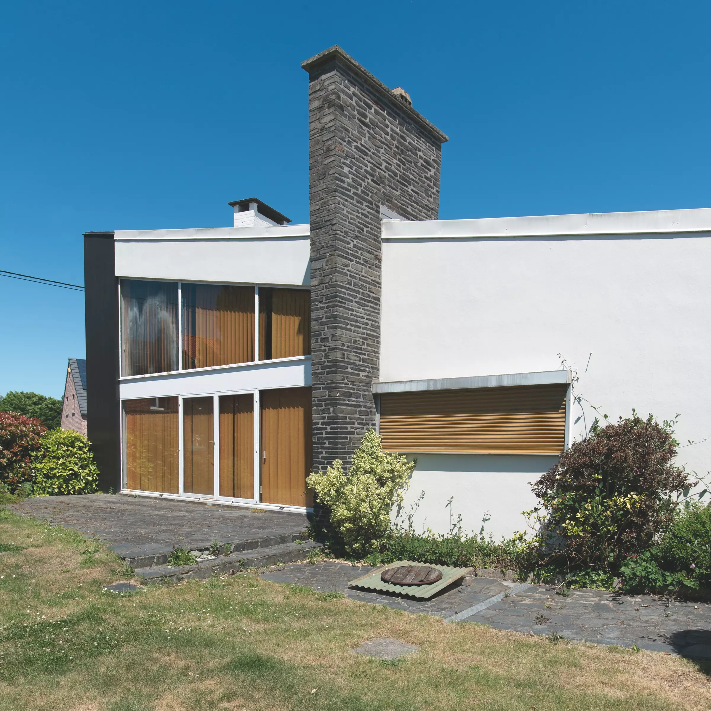 Implantée sur une parcelle d'angle, la bâtisse se développe en deux volumes sur un plan en L. La maison se caractérise par une esthétique très sobre, à l'expression fonctionnelle s'inscrivant dans les préceptes du modernisme de l'après-guerre. Sa volumétrie simple se résume à un toit en appentis de tôle et à des façades enduites dont le traitement approche l'abstraction géométrique. Les grandes surfaces immaculées qu'elles forment sont percées avec parcimonie de quelques baies, dont des vitrages carrés à l'encadrement minimaliste. Seule note de couleur, la porte d'entrée crée un événement à l'articulation des deux ailes. Parfois décrié pour sa froideur, ce type d'architecture trouve ici un exemple particulièrement soigné du style.