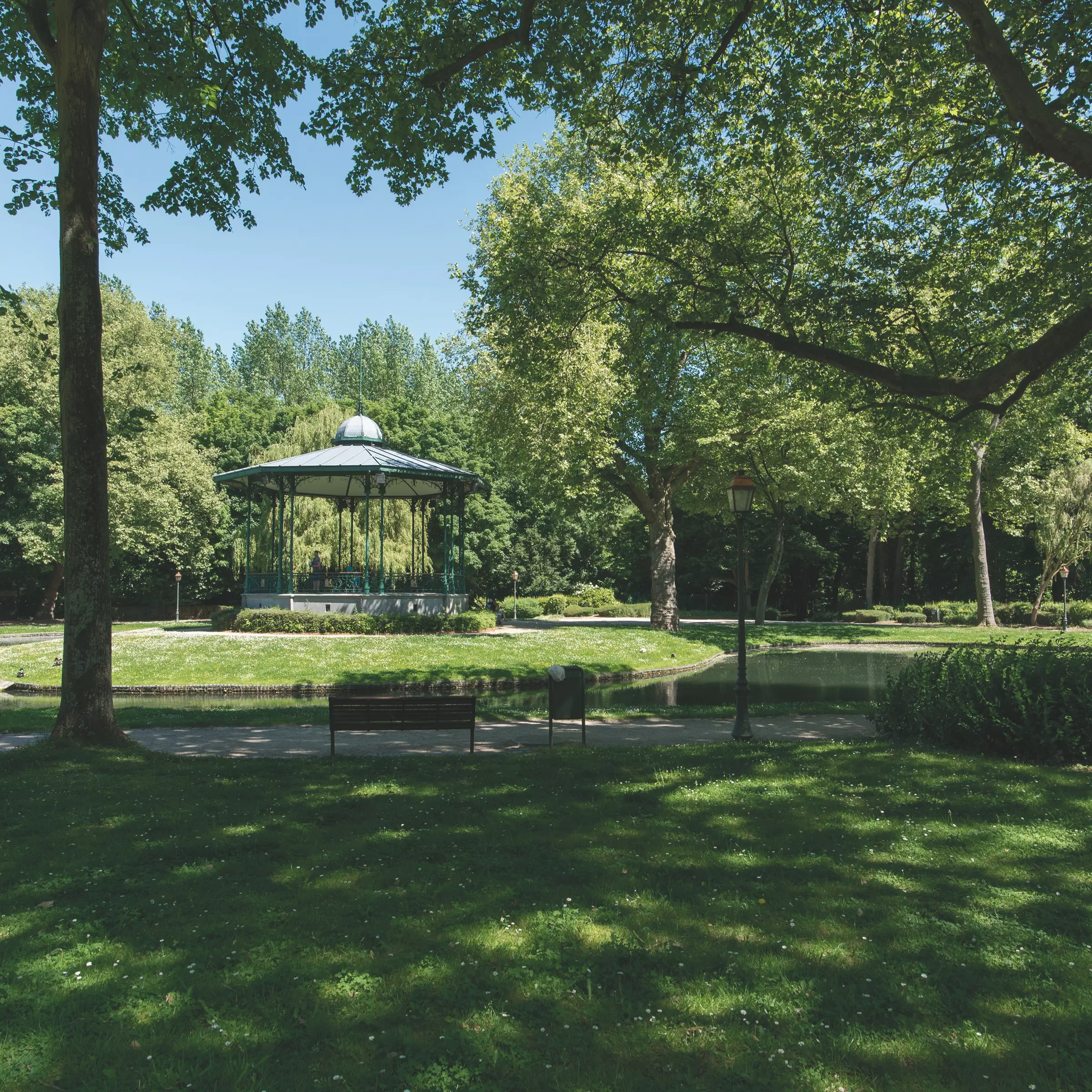 En 1894, le paysagiste Louis Fuchs intègre au parc existant une « promenade publique ». Le plan s'articule au départ d'un kiosque offrant un point de vue sur les rocailles, les arbres et le pavillon. Les berges de l'étang dessinent des courbes typiquement Art nouveau. Les nombreuses fontaines et bassins font de l'eau un élément omniprésent dans ce jardin clos par une ceinture d'arbres. Le projet du kiosque est confié au jeune architecte péruwelzien Léon Pavot, qui travaille notamment pour Victor Horta. La structure se dresse pour être vue de la rue avec en arrière-plan un écran de verdure. Sa silhouette dévoile une véritable dentelle métallique dont les ferronneries laissent transparaître les formes stylisées des végétaux.