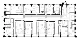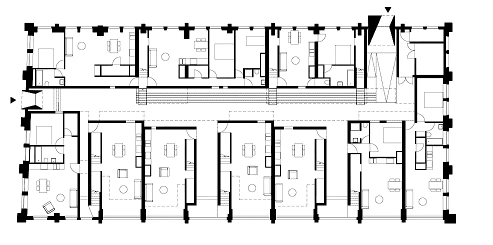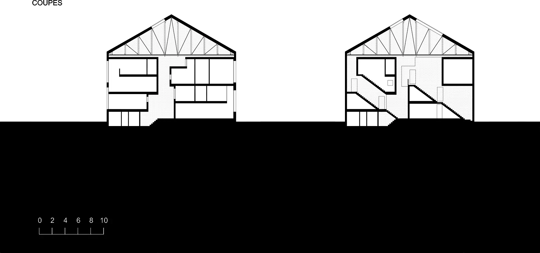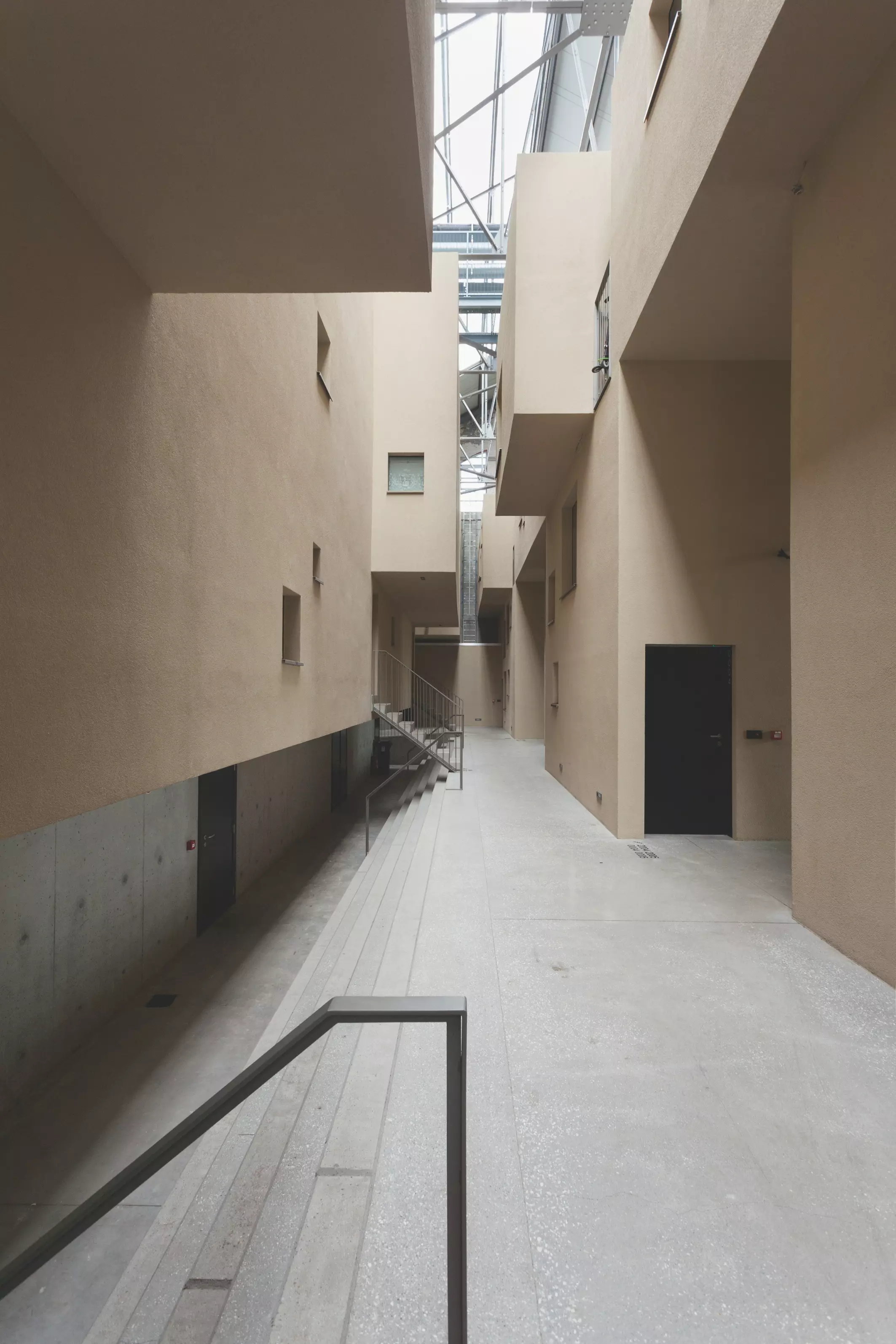 Au-delà de la création d'une nouvelle entrée discrète, les façades ne subissent aucun changement ; les dimensions et le découpage des fenêtres ne sont pas altérés. Les vingt-quatre logements se développent à travers la grande halle, sur deux niveaux, autour d'un axe central baigné de soleil, assimilable à une rue intérieure. Les appartements, en simplex ou en duplex, jouent avec les doubles hauteurs qu'imposent les châssis existants ainsi que la différence de dénivelé qui séparait originellement en deux la construction. Une kyrielle de petites ouvertures constellent les façades de la « rue intérieure », apportant aux larges surfaces enduites et lumineuses des rythmes et des respirations.