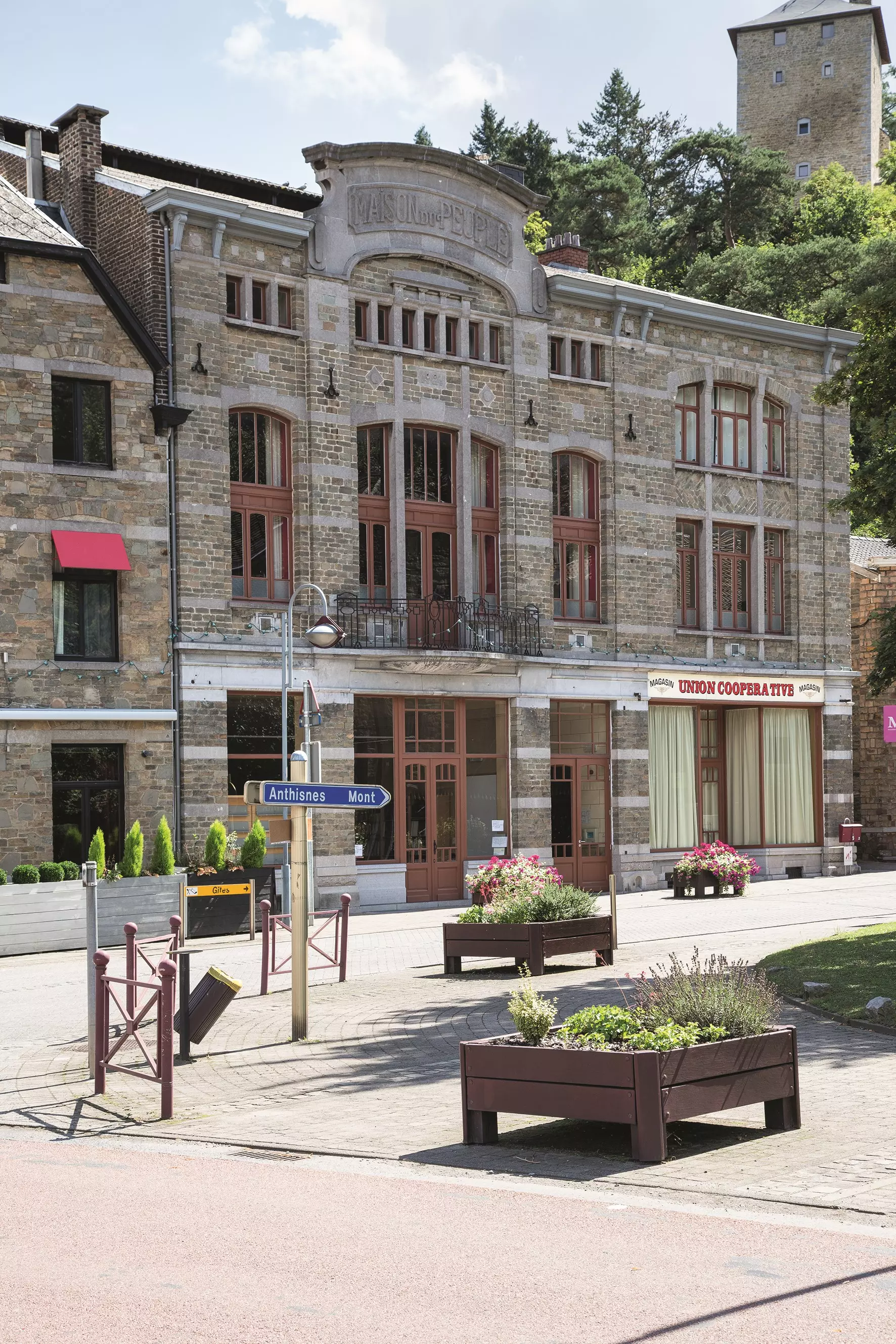 Les matériaux utilisés, moellons et pierre bleue, confèrent au lieu un caractère traditionnel qui s'harmonise avec l'architecture et les métiers locaux. Les façades transgressent totalement avec l'intérieur, de style Art déco, très bien conservé – le magasin de l'Union coopérative restera actif jusqu'en 1989 – et récemment restauré en Maison de village (espace polyvalent).