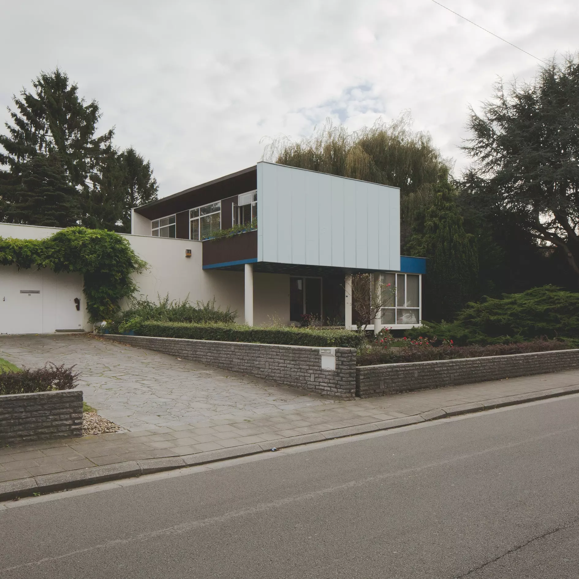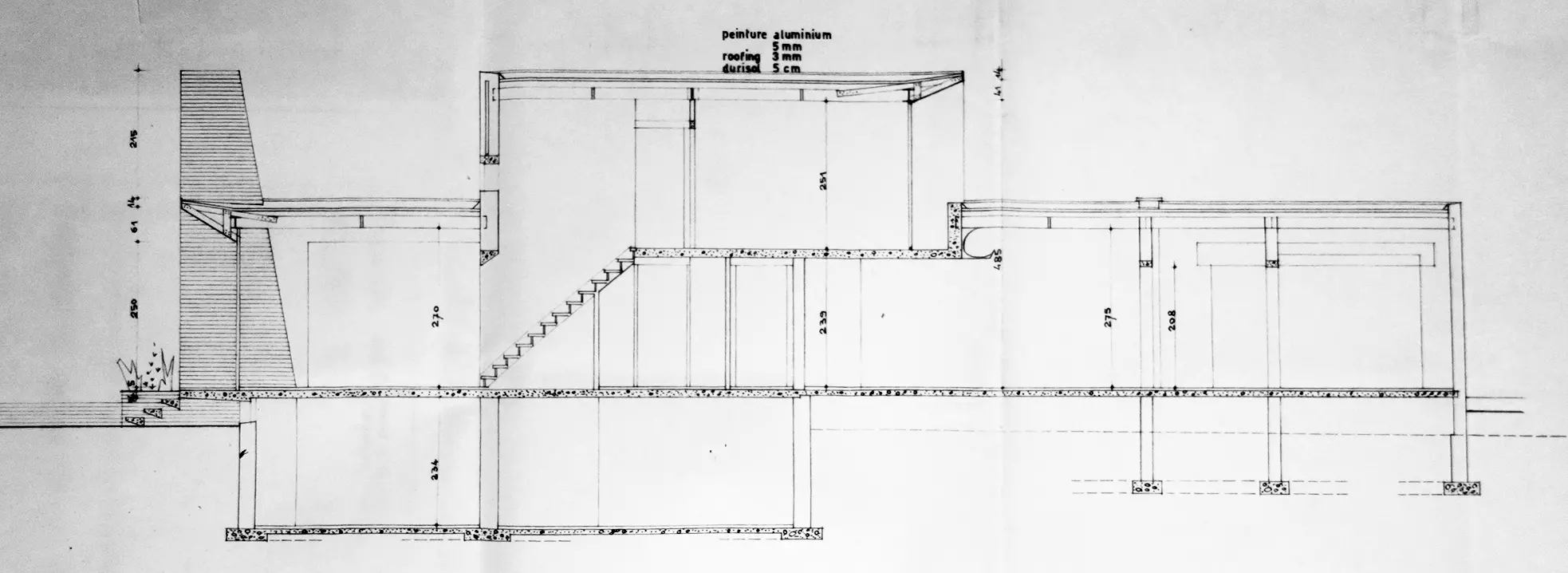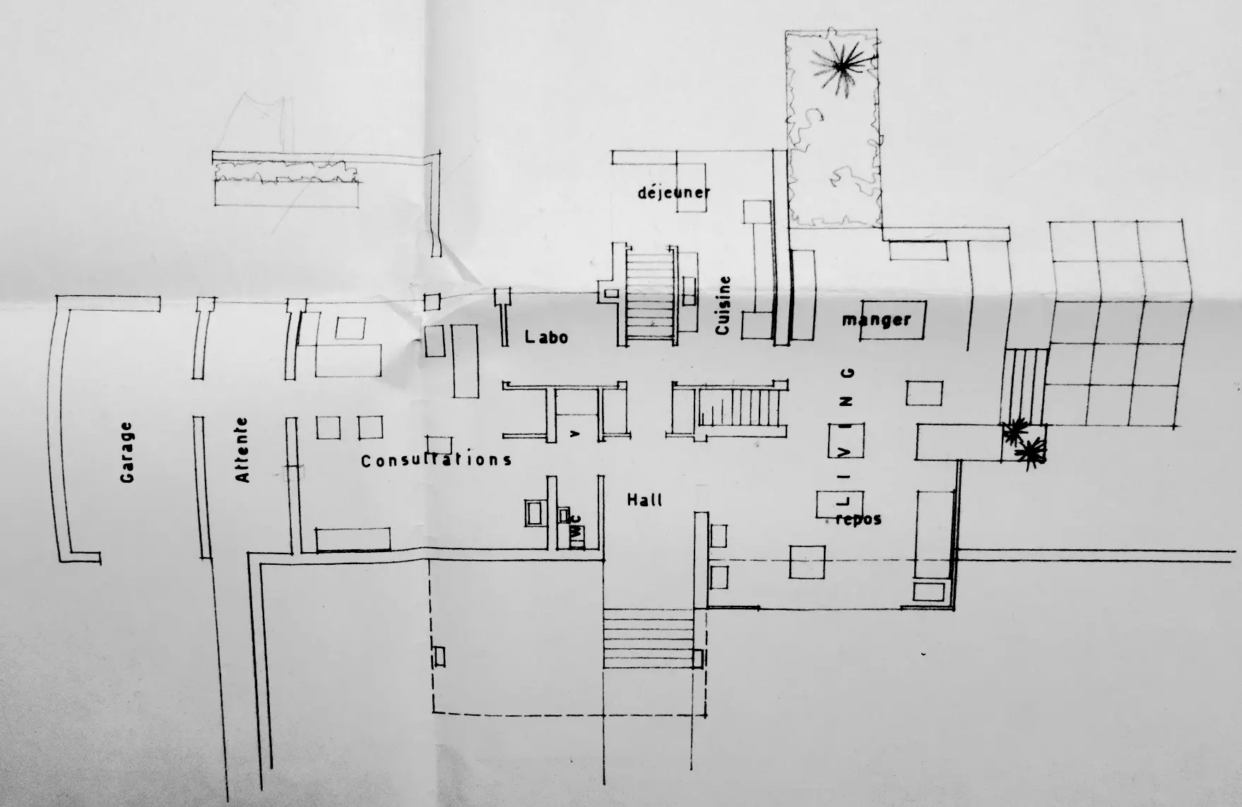 Implantée sur une parcelle formée par le regroupement de plusieurs terrains, la maison présente l'assemblage de deux volumes perpendiculaires superposés. Au rez-de-chaussée, le hall d'entrée et la cuisine séparent le salon et la salle à manger de la partie dévolue au cabinet de médecine.
