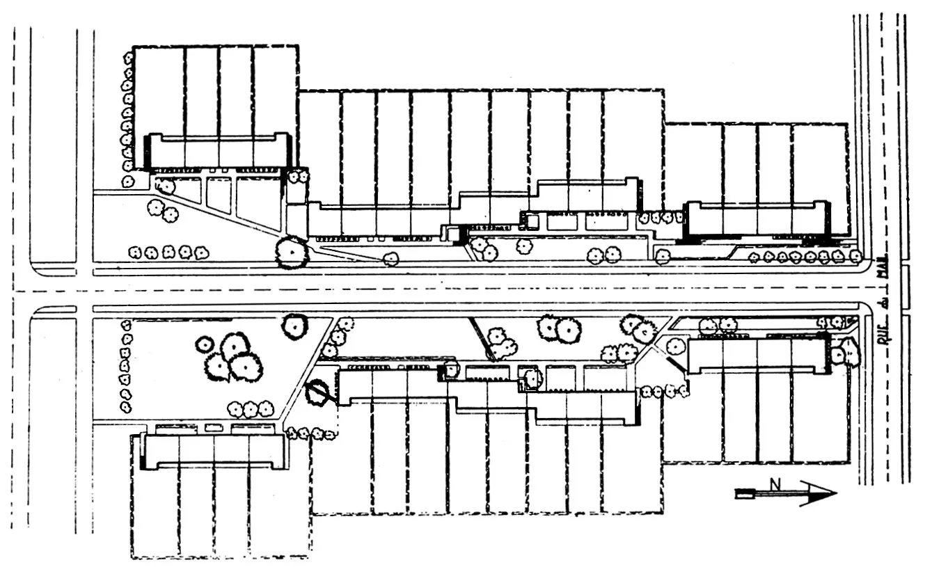 Le groupe de trente-trois habitations est disposé le long d'une seule rue. L'implantation initiale montre la volonté de Jacques Dupuis de créer des espaces variés et de doter l'ensemble d'un caractère singulier tout en proposant, dans un souci d'économie de moyens, un langage modeste. Le maintien d'une légère déclivité, la disposition de larges pelouses devant les maisons et le soin apporté aux plantations sont des caractéristiques qui rappellent les cités-jardins de l'entre-deux-guerres.