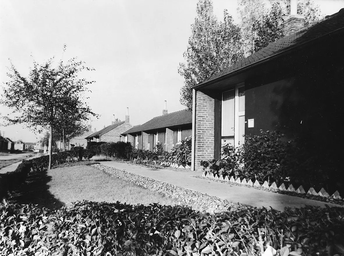 Le décalage entre les groupes de maisons est enrichi par le contraste entre les pignons et les façades. À l'origine, celles-ci étaient peintes de couleurs différentes et cadrées par les murs de refend mitoyens en briques apparentes et les avancées de toitures, le tout composant un équilibre graphique mesuré et sobre. Les châssis et les cheminées d'origine, aujourd'hui remplacés, renforçaient le graphisme de cette composition.