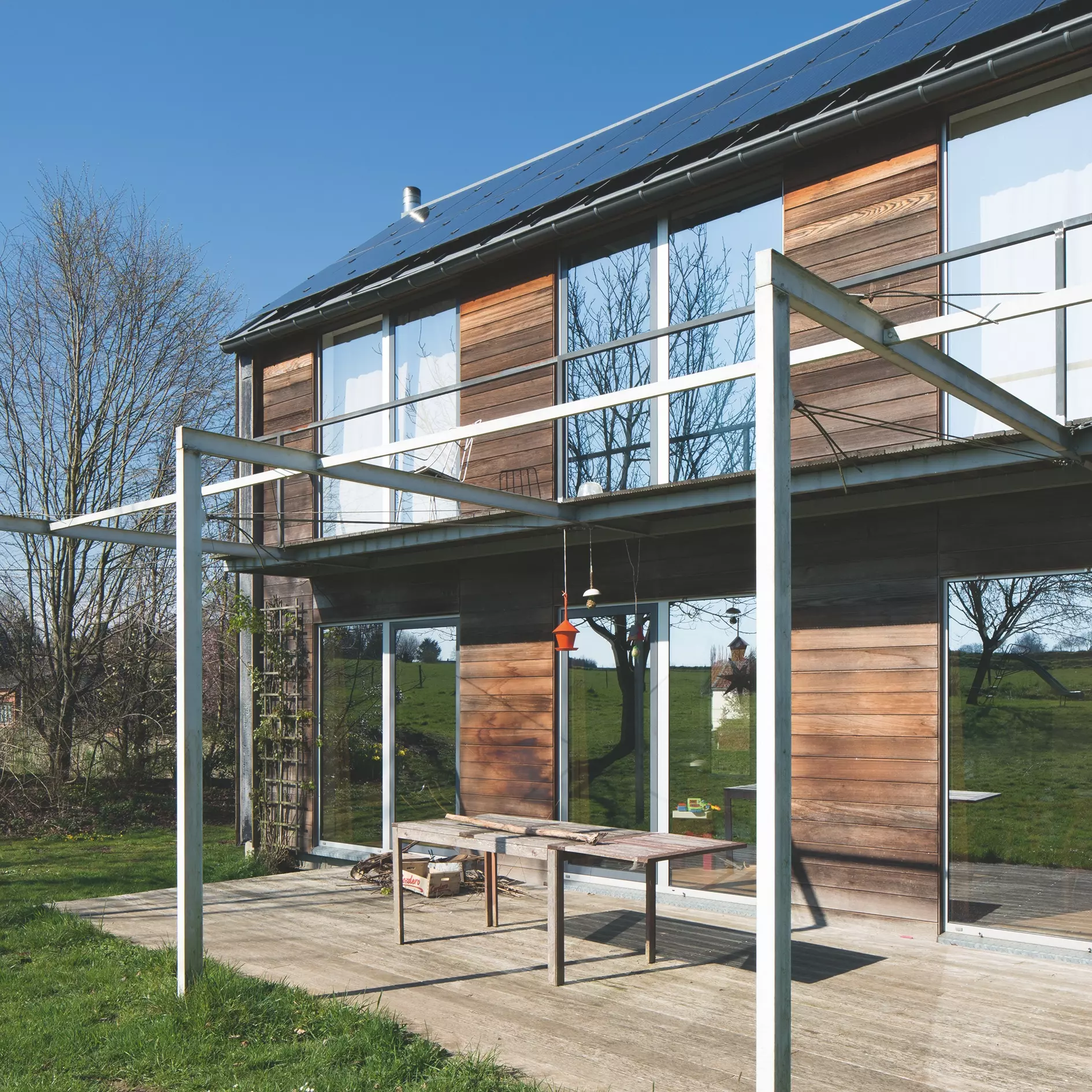 Accessible depuis une passerelle enjambant un cours d'eau, la construction se fond parfaitement au paysage bucolique de la vallée. Les proportions sobres et harmonieuses de cette architecture – première réalisation d'Hugo Bauwens – émanent d'un souci esthétique et constructif (ossature bois) découlant de l'imbrication d'un volume principal bardé (pièces d'habitation) et d'un volume annexe enduit (garage).