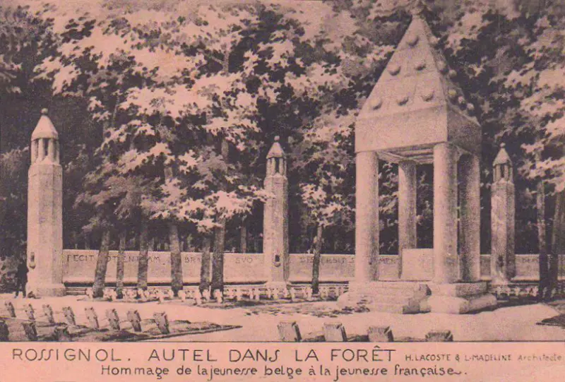 Le projet est confié à Louis Madeline, architecte français, et à Henry Lacoste. Ce dernier développe entre autres, à cette époque, une réflexion originale sur le thème de l'architecture funéraire et commémorative qui donne lieu à de nombreux projets et réalisations, dont notamment le monument des soldats belges édifié en 1922 au cimetière du Père Lachaise à Paris.