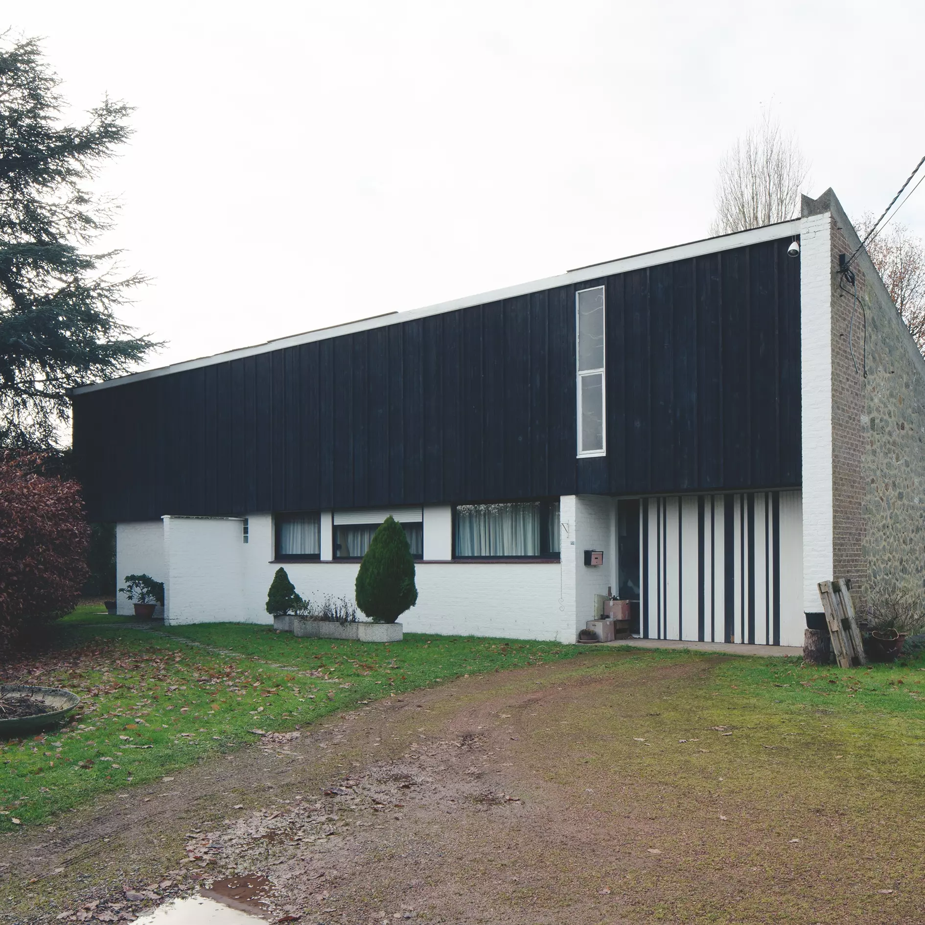 La disposition des fonctions est optimisée selon l'orientation. L'horizontalité du volume, accentuée par un fenestrage en bandeau ainsi que par la maçonnerie en briques au rez-de-chaussée, contraste, à l'étage, avec la pose verticale du bardage en bois foncé et une baie étroite. Par sa couleur blanche et noire, la porte du garage opère une transition subtile entre ces deux compositions complémentaires. Un mur pignon massif en moellons, surmonté d'un couvre-mur en béton au profil particulier, protège l'habitation de l'exposition nord.
