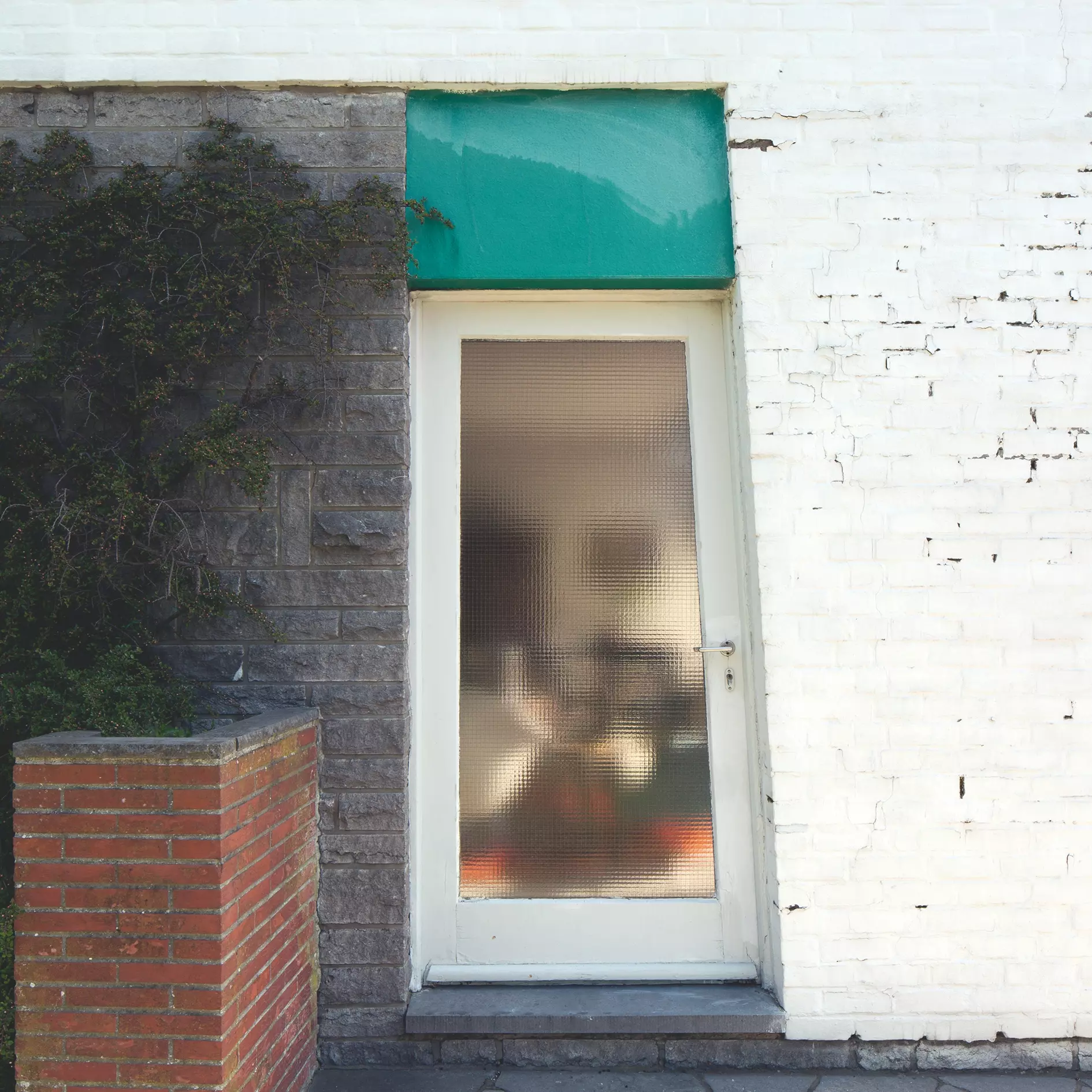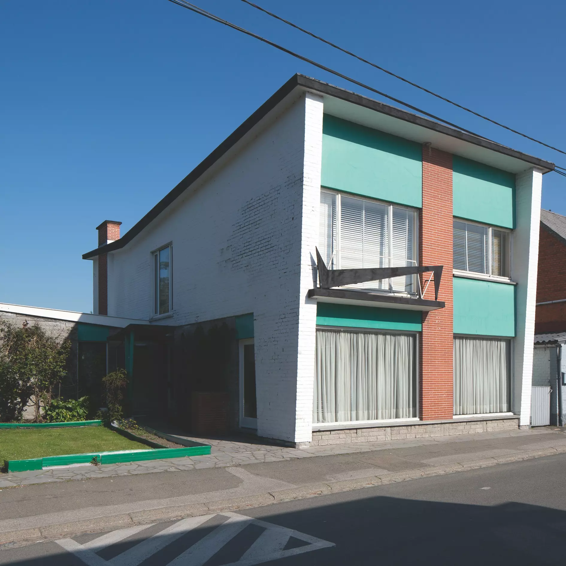 L'entrée de l'habitation, plus en retrait, est indiquée par un auvent supporté par une pile en V. Le plan en L permet de dissocier la partie publique (sur la rue) de la partie privée (sur un large terrain). La volumétrie est dynamisée par le jeu des matériaux, la polychromie ainsi que différents éléments : les arêtes obliques des murs pignons porteurs, la toiture principale à doubles pans inversés et celle du salon à pan unique incliné, les débordements et le travail sur l'épaisseur des rives de toiture.