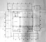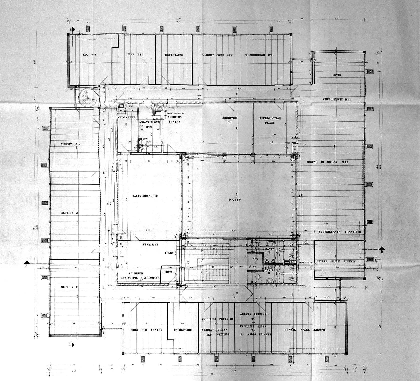 Les étages reposent sur une structure en béton qui, au niveau du rez-de-chaussée, délimite une galerie extérieure avant de suivre le décaissement du volume supérieur et de revenir en façade aux étages pour former un squelette qui rythme verticalement l'édifice. Les dalles sont apparentes et les châssis qui effectuent le remplissage expriment leur ordre vertical secondaire. En retrait sous ce volume, la transparence de l'entrée entièrement vitrée et du patio s'oppose aux murs de briques seulement percés en hauteur d'étroits bandeaux de fenêtres horizontales.