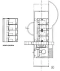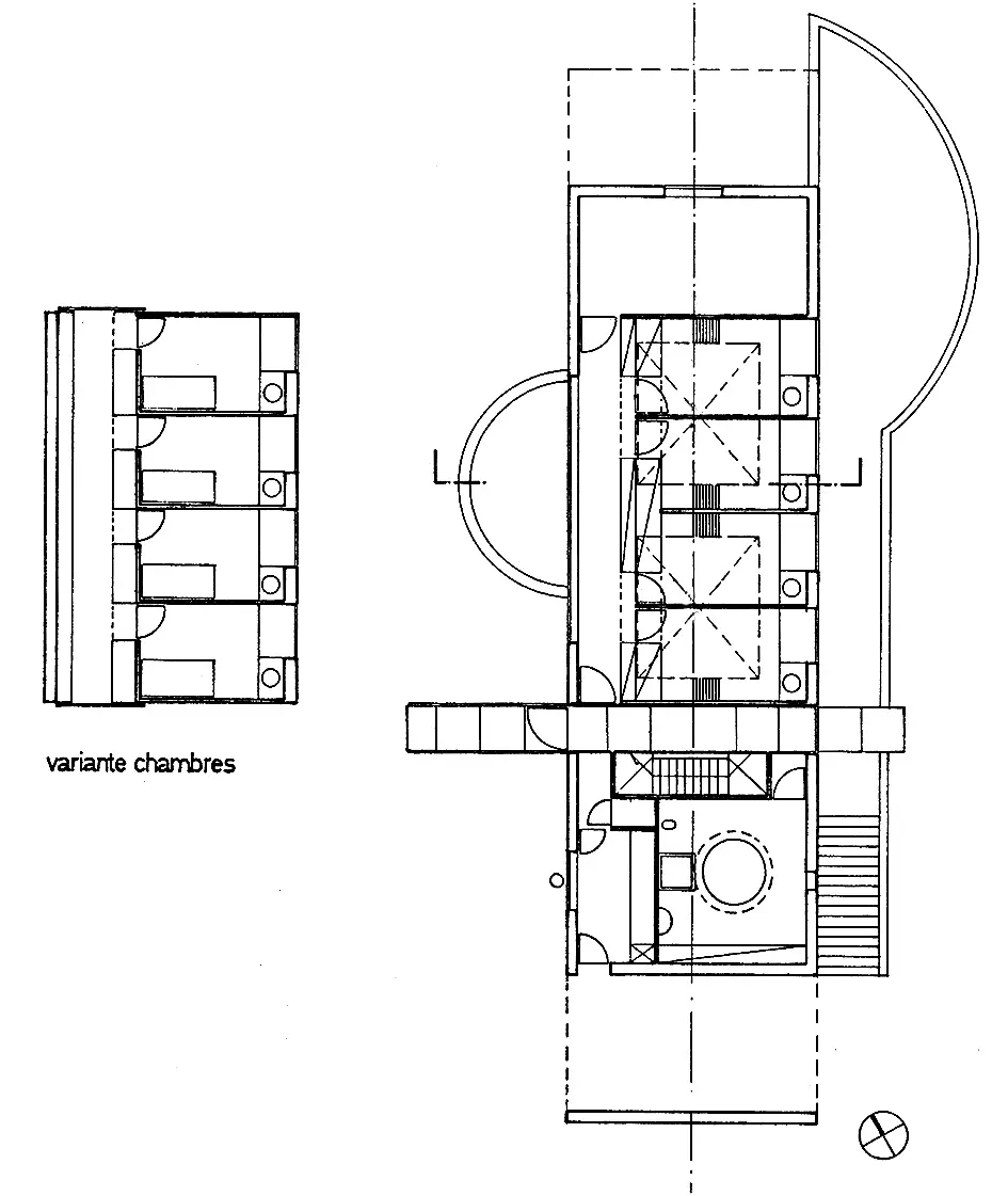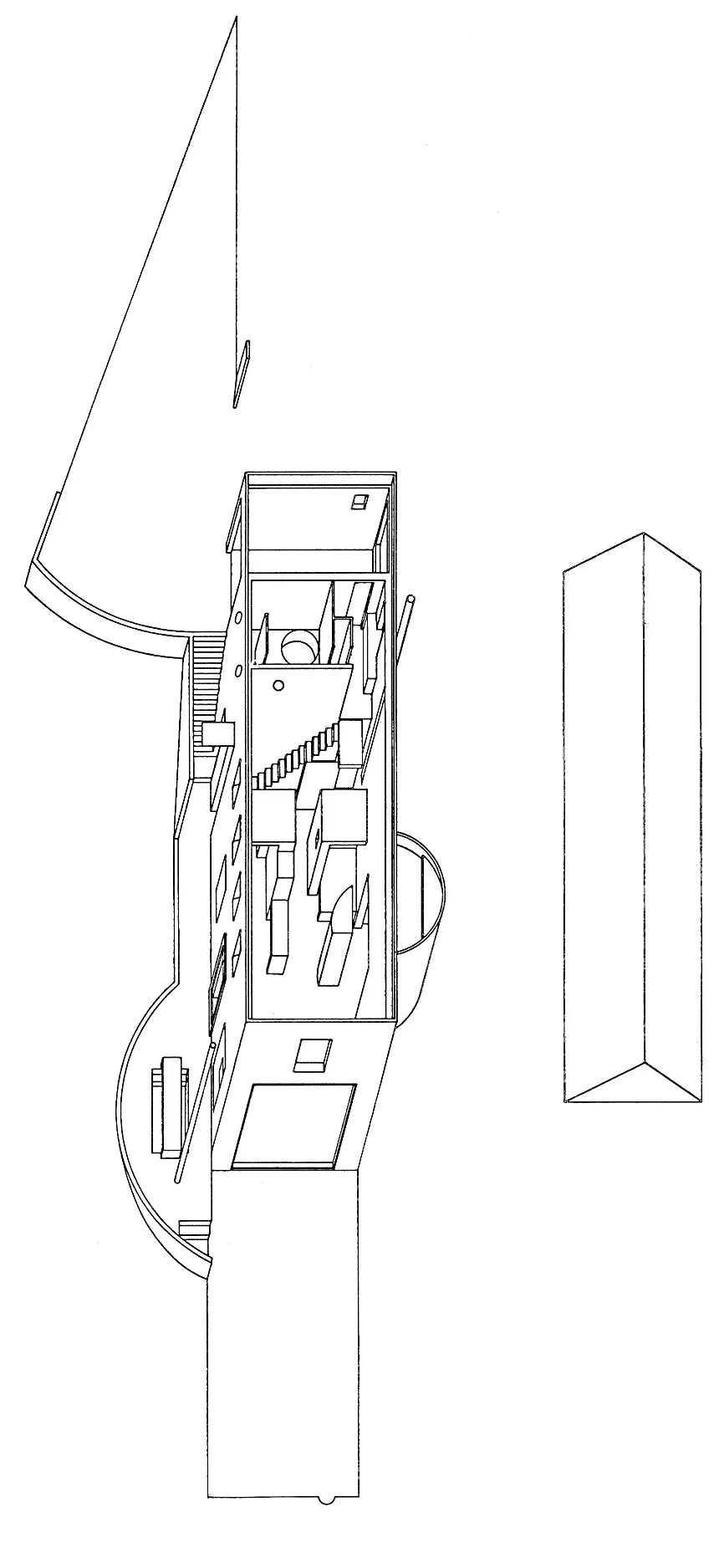La forme de la construction est déterminée par un jeu de volumes simples rappelant chacun les géométries élémentaires de la maison archétypale. Le parallélépipède rectangle à partir duquel s'organise le plan s'allonge significativement alors que le toit qui devrait en suivre les contours est décalé de quelques mètres. Déplacé après le garage, il s'allonge par-delà le corps du bâtiment et recouvre la terrasse en aval. L'étage supérieur, au niveau de la rue, est composé d'une série de chambres en enfilade desservies par un couloir latéral. L'étage inférieur est, quant à lui, moins strictement organisé : cuisine, salle à manger et salon sont disposés dans un plan ouvert augmenté d'une extension semi-circulaire.
