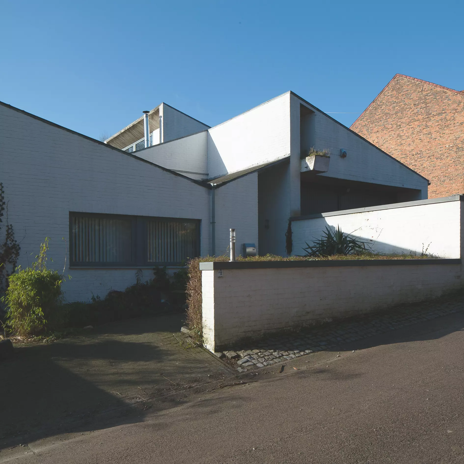 En contraste avec les constructions voisines compactes, mais conventionnelles, plusieurs volumes s'enchaînent en répondant à la complexité programmatique qui prévoit un cabinet de consultation avec une entrée indépendante. Cette fragmentation se traduit à l'extérieur par des toitures inclinées dans plusieurs directions et des profils dynamiques dominés par des obliques.