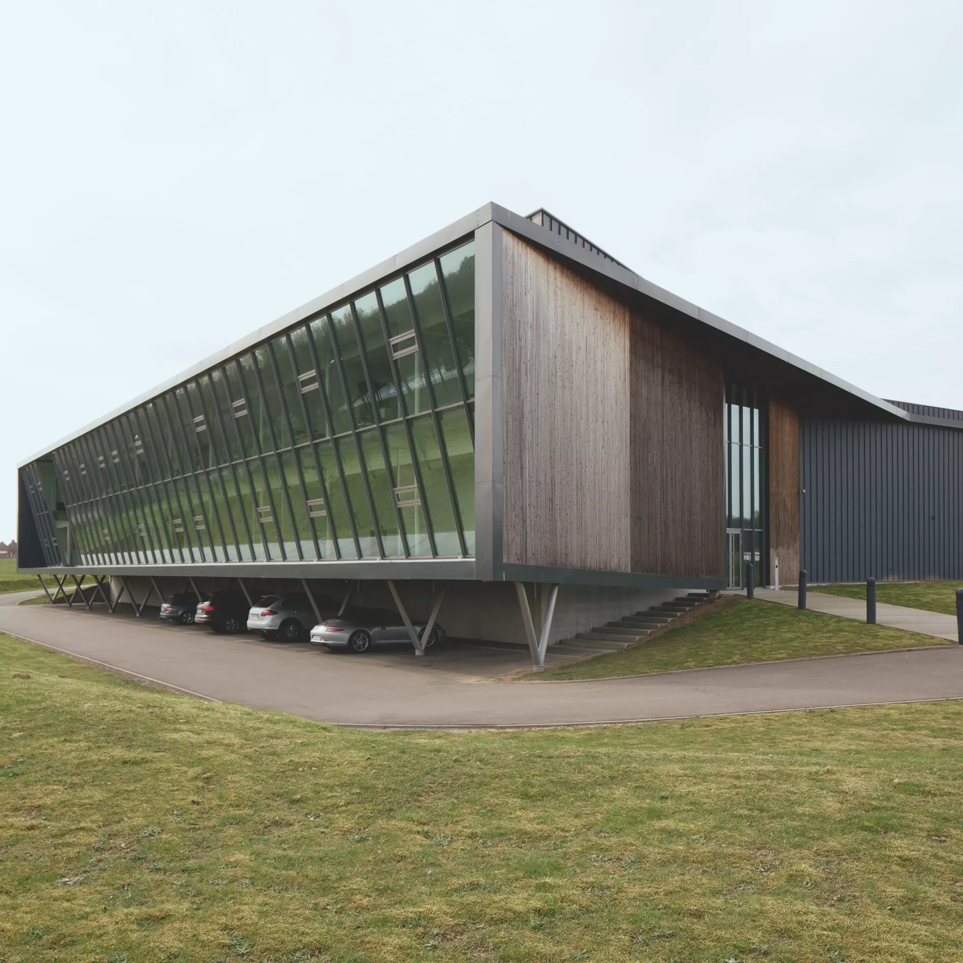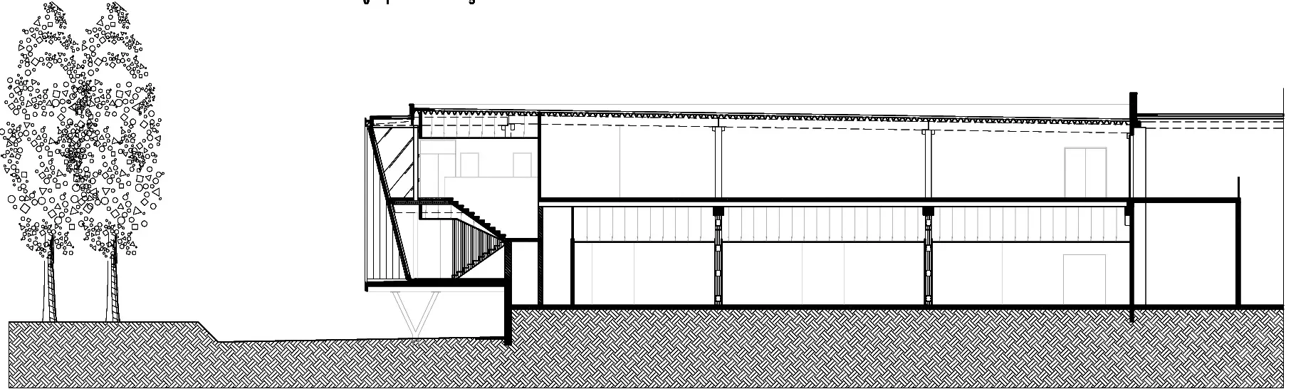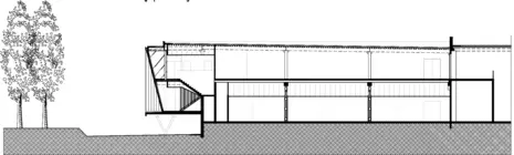 Le bardage métallique noir domine l'expression de la construction. Par contraste, la façade sud est complètement vitrée et inclinée. Un jeu de plis successifs entre la façade latérale, habillée en lattes de bois, et l'avancée de toiture, qui accentue le contraste, accompagne l'accès au bâtiment.