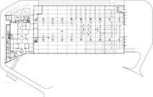 La partie principale abrite le stockage, habillé d'une façade homogène et aveugle. Les éclairages zénithaux, soigneusement disposés, offrent le confort nécessaire au travail. Les espaces de bureaux, orientés sud et disposés sur deux niveaux, sont dans un volume qui surplombe un dénivellement du terrain. L'espace qui se dégage en dessous permet de disposer des parkings. Des colonnes métalliques en V soutiennent le volume et renforcent le dynamisme de l'expression architecturale.