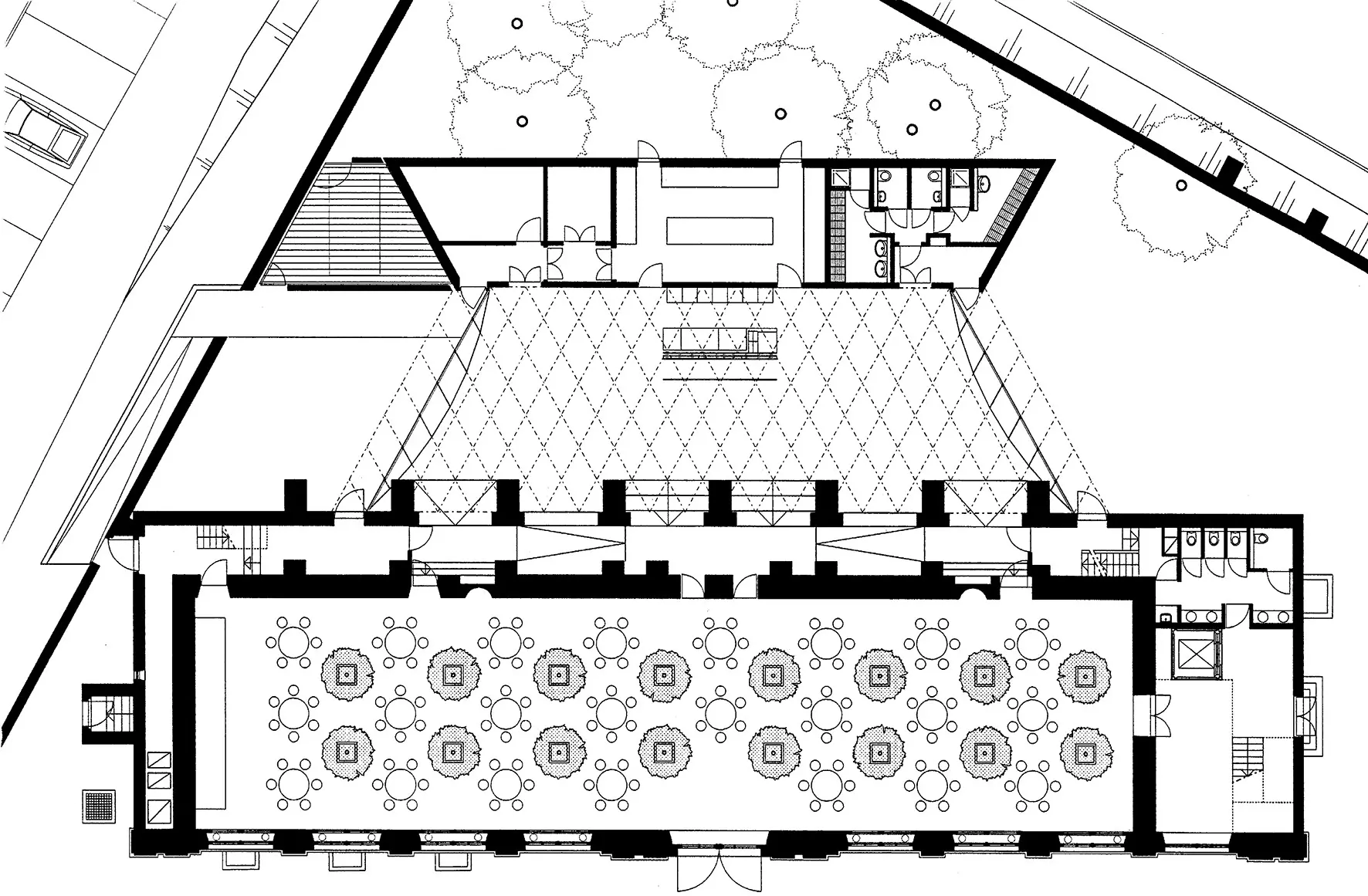 Sous la verrière de liaison, pour laquelle Philippe Samyn se serait souvenu, selon Pierre Loze, des « extraordinaires charpentes métalliques » du Russe Vladimir Choukhov, prend place la cafétéria, baignée de lumière, communiquant avec l'orangerie par des ouvertures ménagées dans le mur nord, entre les contreforts ajoutés en 1979. Les cuisines et sanitaires prennent place dans le nouveau volume.